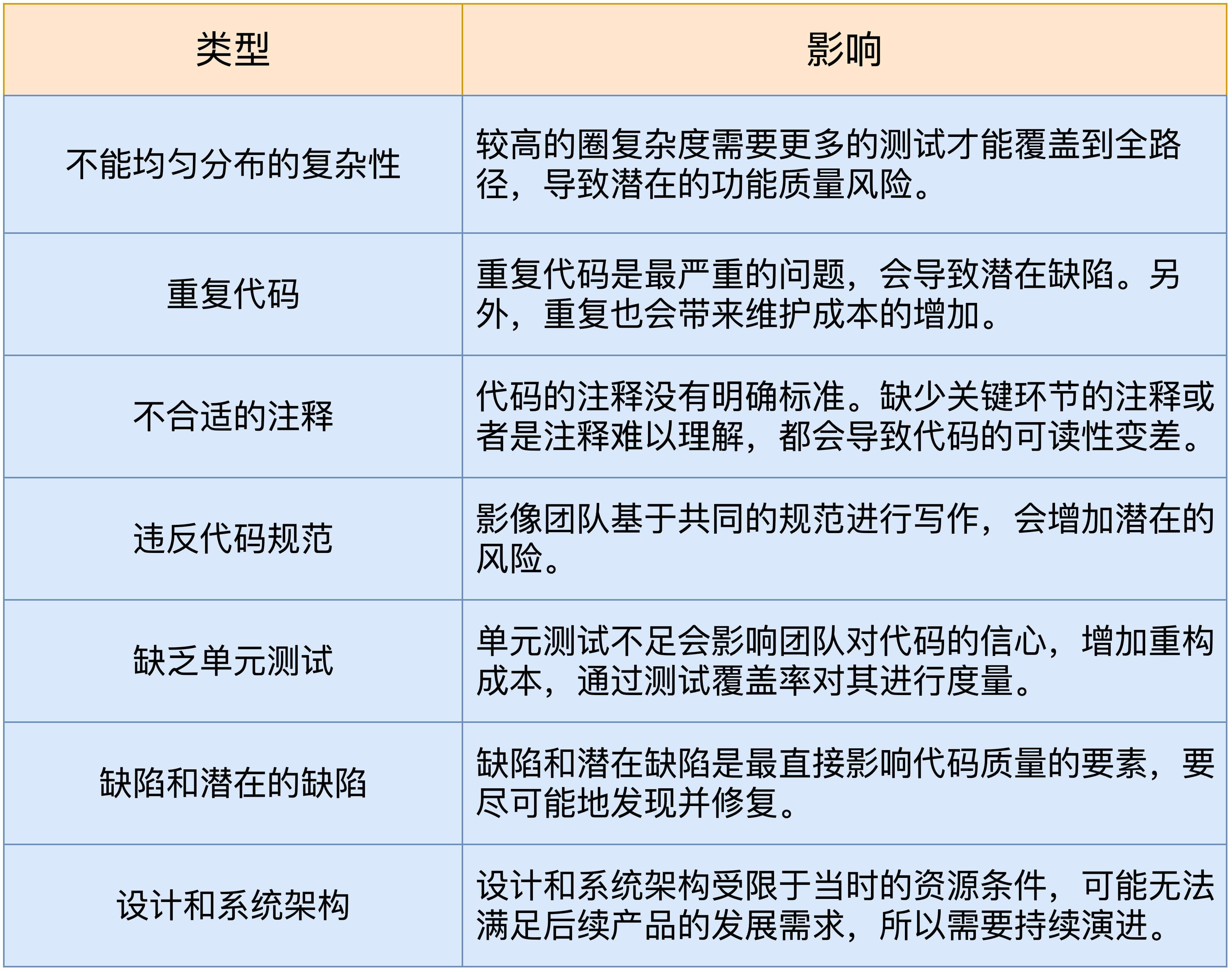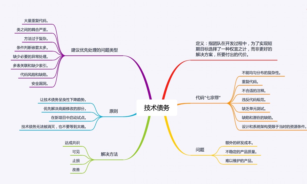 除了低质量的代码问题之外,还有很多其他类型的技术债务,比如不合理的架构、过时的技术、冷门的技术语言等等。