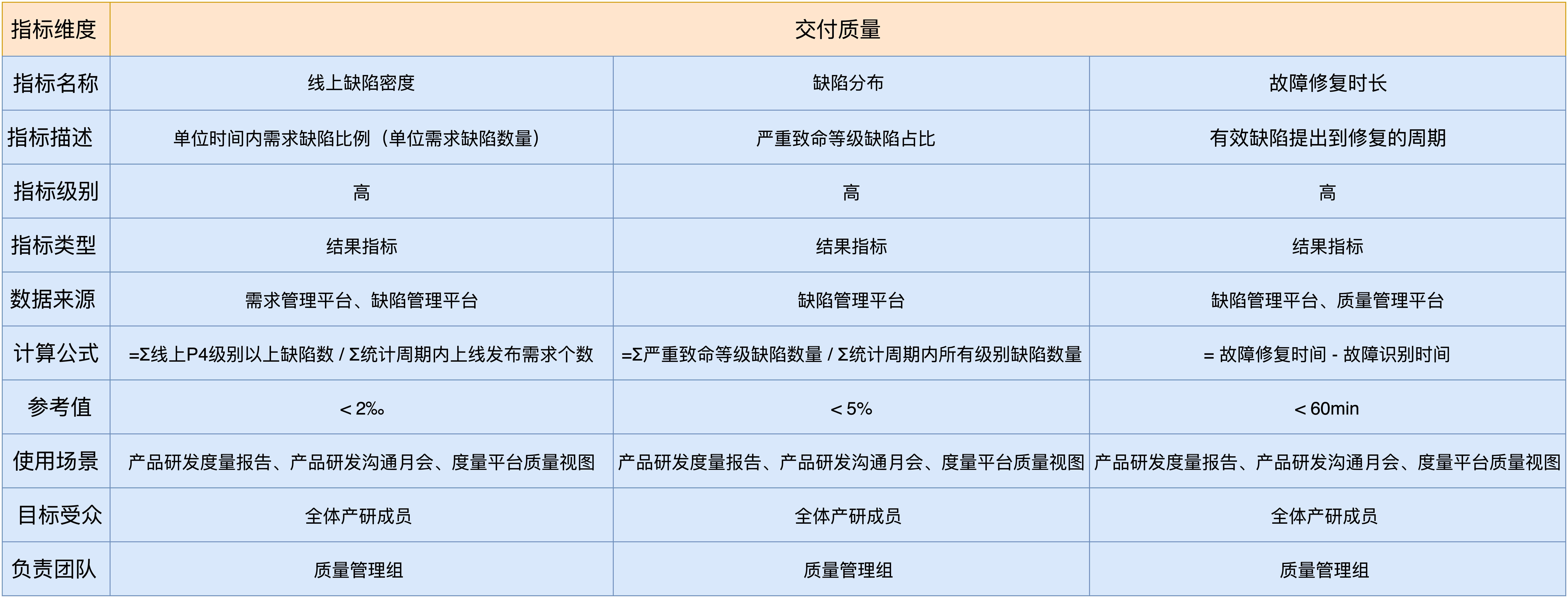 • 线上缺陷密度:单位时间内需求缺陷比例,也就是平均每个需求所产生的缺陷数量,缺陷越多,说明需求交付质量越差。