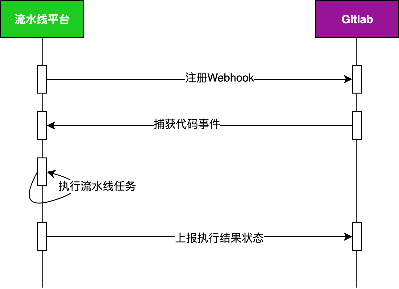 流水线平台接收到接口访问后,可以根据规则过滤请求,最典型的就是触发分支信息。当满足规则条件后,则执行流水线任务,并将结果再次通过Gitlab的API写回到代码仓库中。这样一来,每次提交历史都会关联一个流水线的执行记录,可以用于辅助代码合并评审。