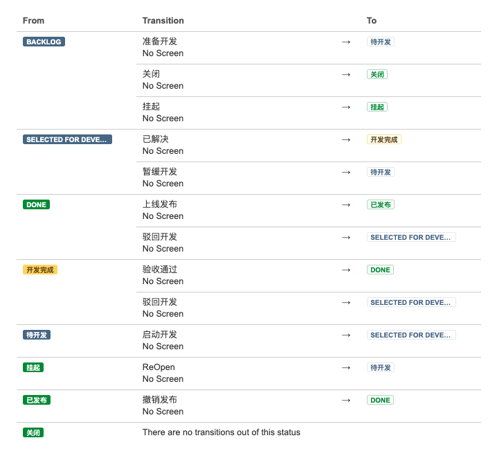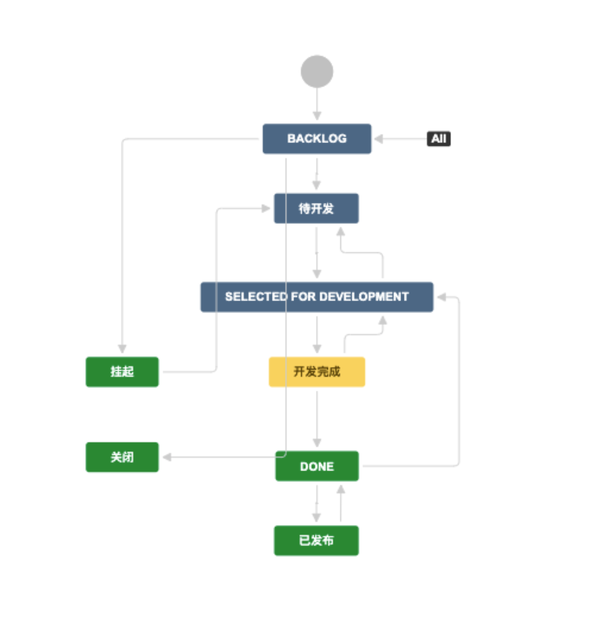 需求统一纳入Backlog管理,当迭代开始时,就拖入待开发状态,研发挑选任务启动开发,并进入开发中。当开发完成后,也就意味着功能已经在测试环境部署。这个时候,就可以等待功能验收。只有在验收通过之后,才会发布到预发布环境。并经过二次验收后,最终上线发布给用户。
