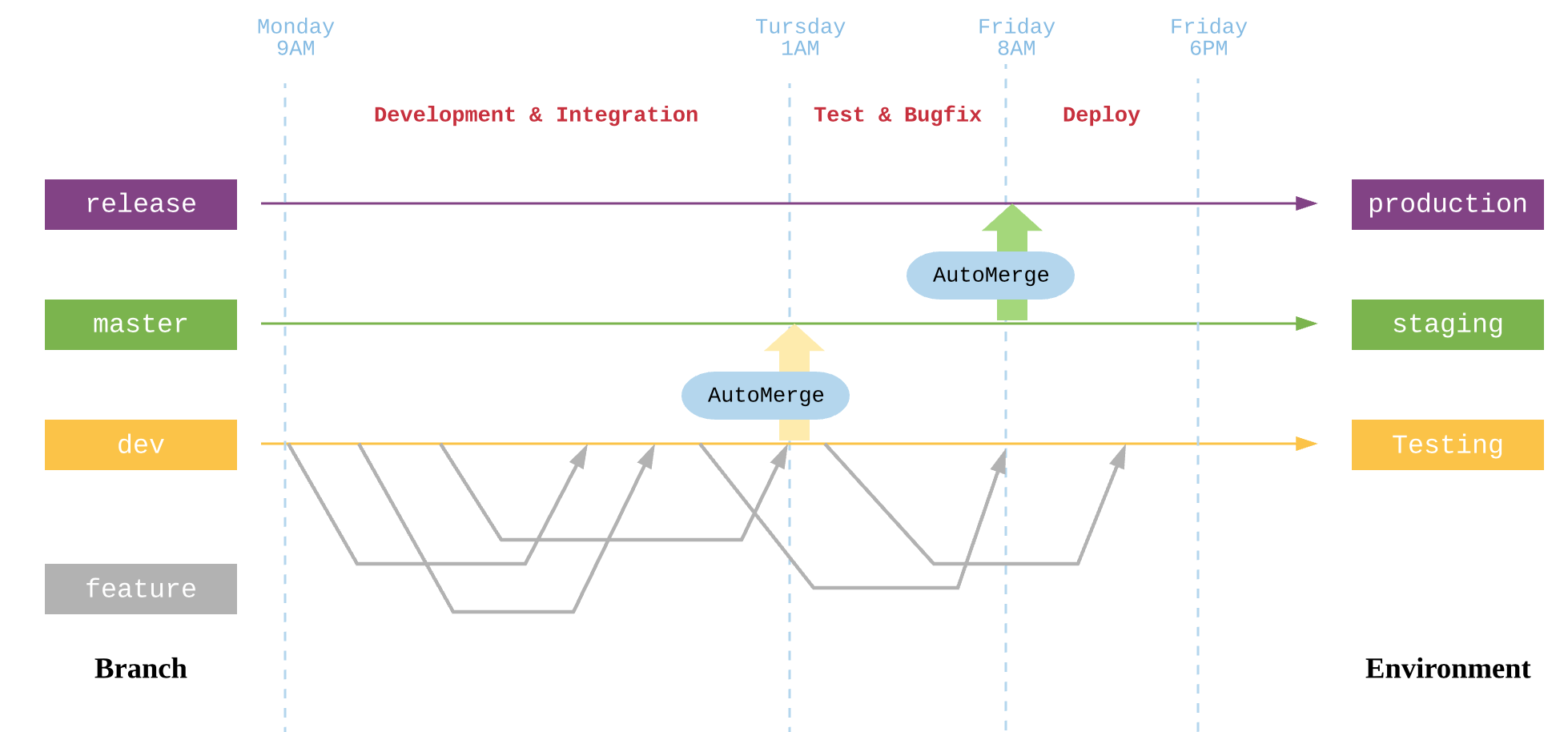 接下来,定期每周两次从dev上master分支,master分支对应了预发布环境,保证跟生产环境的一致性,数据也会定期进行同步。只有在预发布环境最终验收通过后,才具备上线生产环境的条件。通过将master分支合并到release分支,最后完成生产环境部署。这种分支策略的示意图如下: