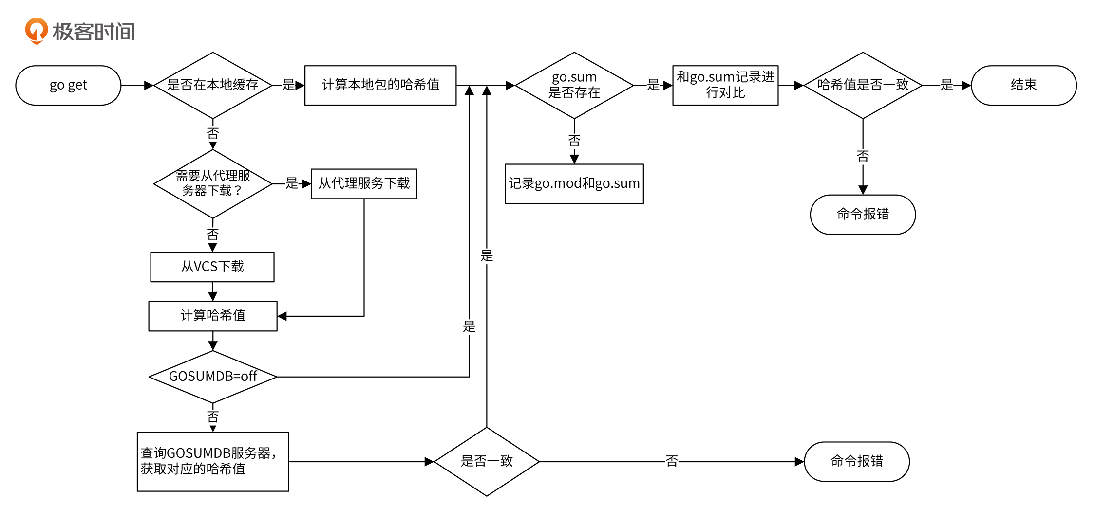 如果设置GOSUMDB为off,或者使用go get的时候启用了-insecure参数,Go就不会去对下载的依赖包做安全校验,这存在一定的安全隐患,所以我建议你开启校验和数据库。如果对安全性要求很高,同时又访问不了sum.golang.org,你也可以搭建自己的校验和数据库。
