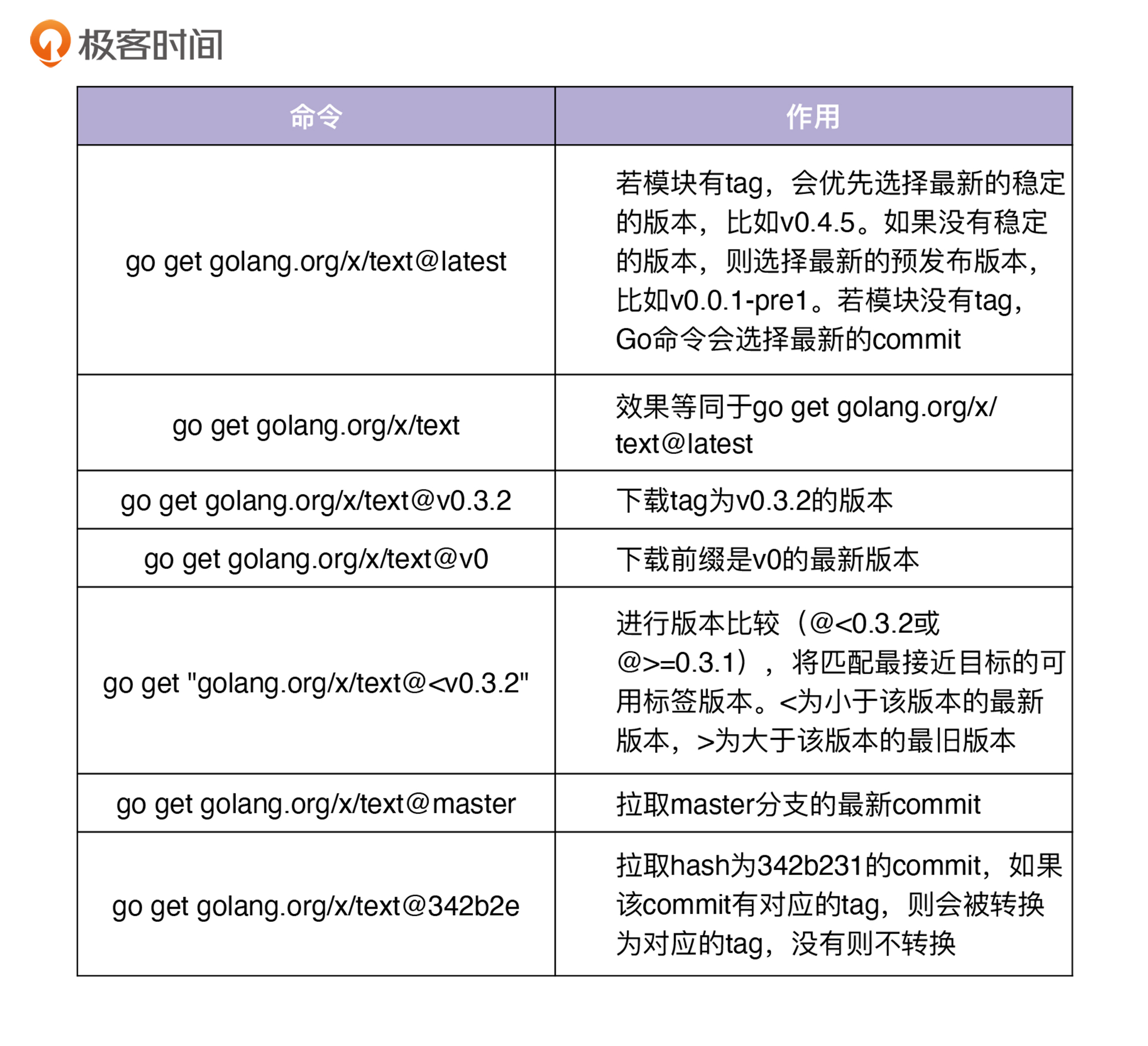 通常,我们通过go get来下载模块,下载命令格式为go get <package[@version]>,如下表所示: