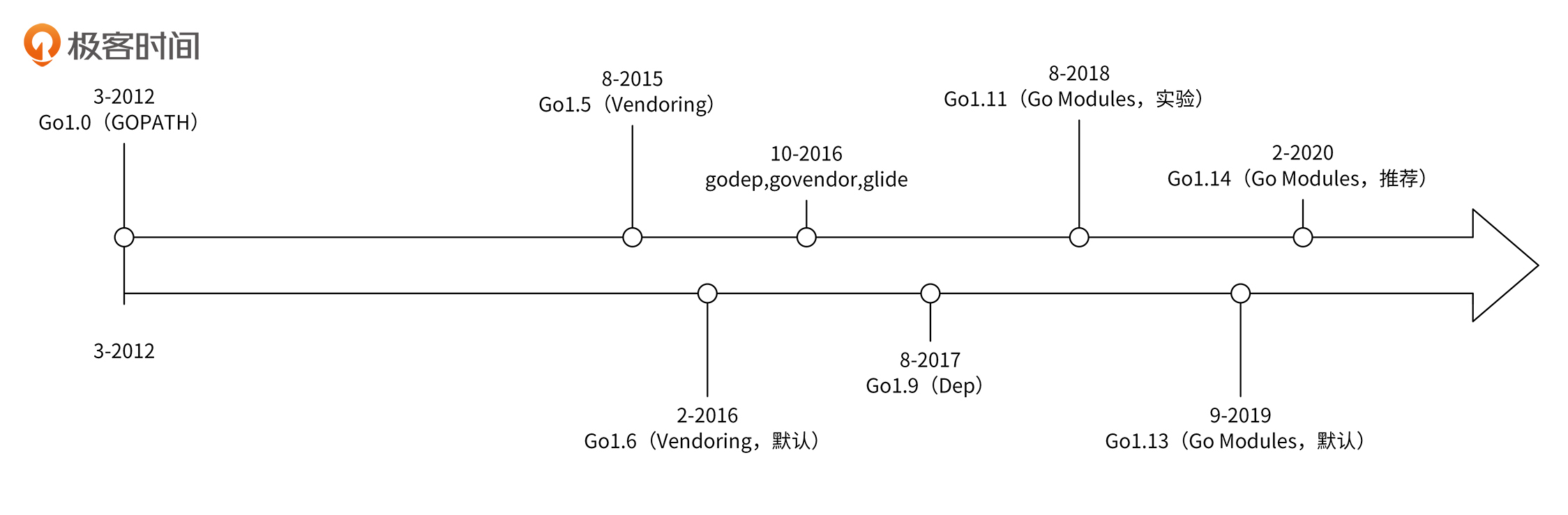 这张图展示了Go依赖包管理工具经历的几个发展阶段,接下来我会按时间顺序重点介绍下其中的五个阶段。