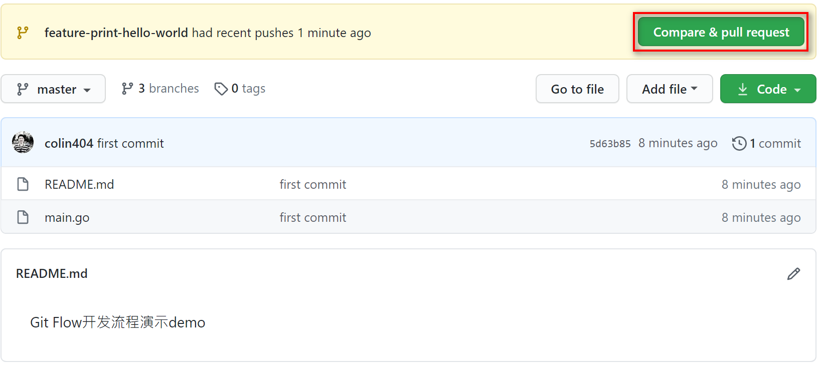 假设我们的 Git 项目名为 gitflow-demo,项目目录下有 2 个文件,分别是 README.md.html 和 main.go,内容如下。