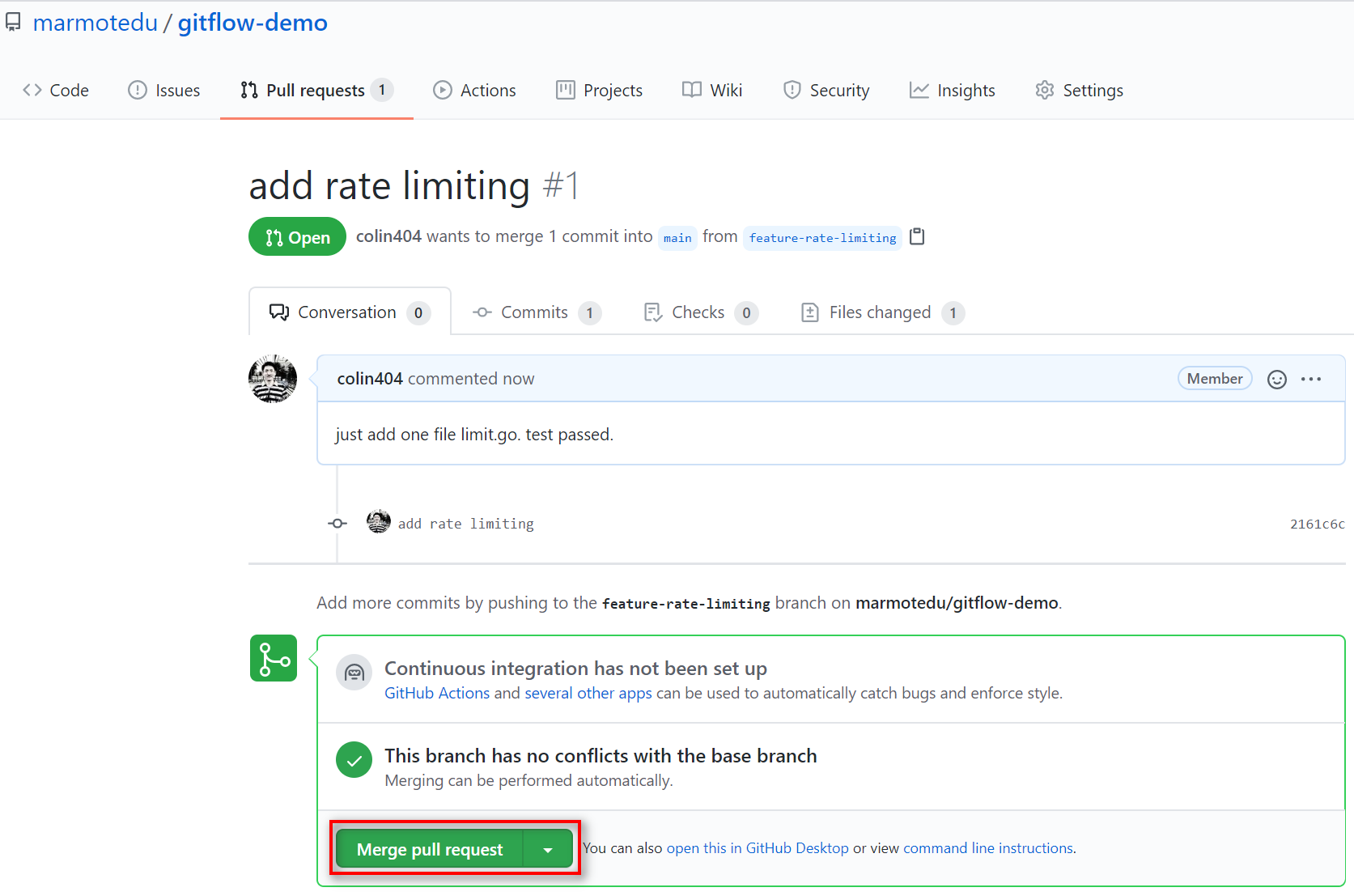 1. 代码管理员收到 PR 后,可以 CR 代码,CR 通过后,再点击 Merge pull request 将 PR 合并到 master,如下图所示。