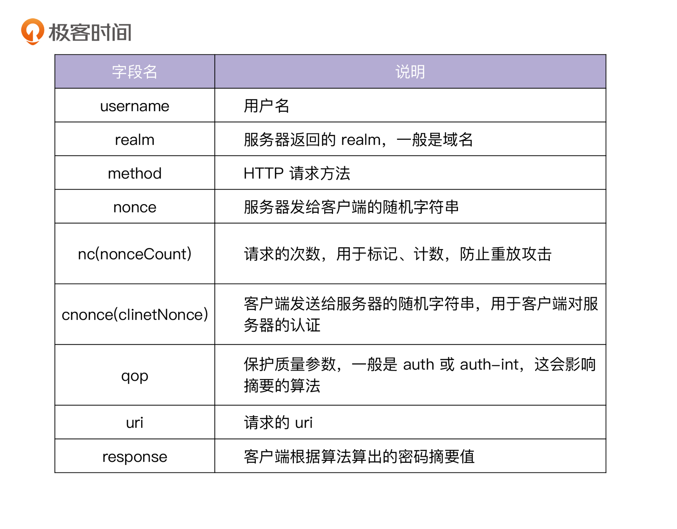 401 Unauthorized,并返回WWW-Authenticate头,里面包含认证需要的信息。WWW-Authenticate头中的信息,选择加密算法,并使用密码随机数nonce,计算出密码摘要response,并再次请求服务端。WWW-Authenticate头中包含的信息见下表: