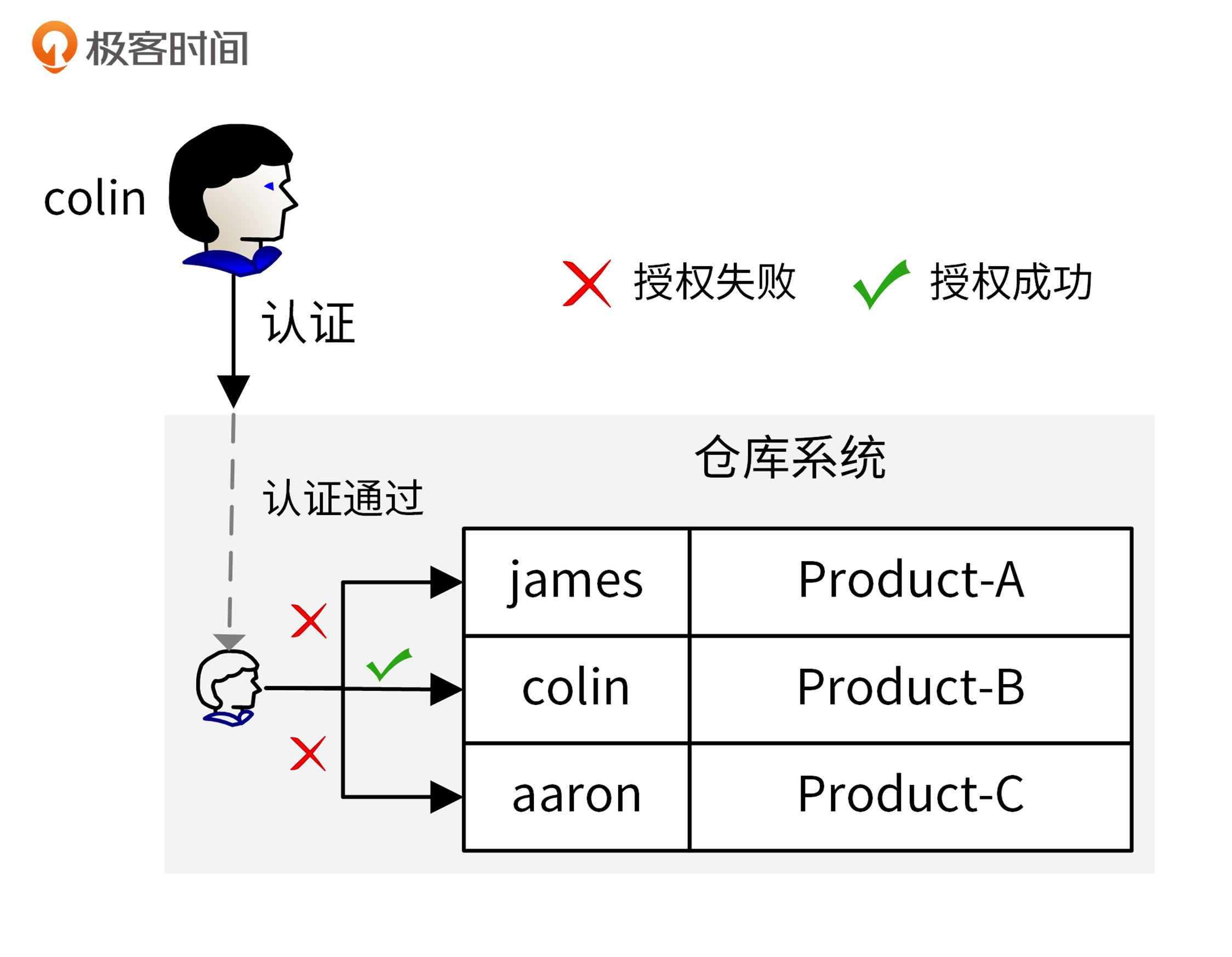 图中,我们有一个仓库系统,用户 james、colin、aaron分别创建了Product-A、Product-B、Product-C。现在用户colin通过用户名和密码(认证)成功登陆到仓库系统中,但他尝试访问Product-A、Product-C失败,因为这两个产品不属于他(授权失败),但他可以成功访问自己创建的资源Product-B(授权成功)。由此可见:认证证明了你是谁,授权决定了你能做什么。