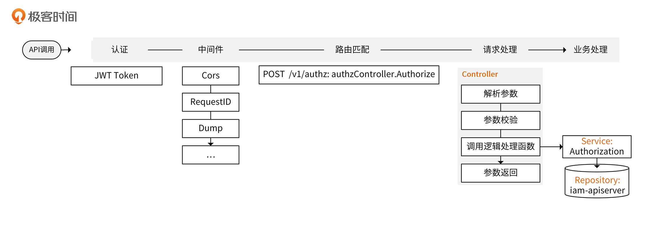 接下来,我们来看下iam-authz-server的具体实现,我会从配置处理、启动流程、请求处理流程和代码架构4个方面来讲解。