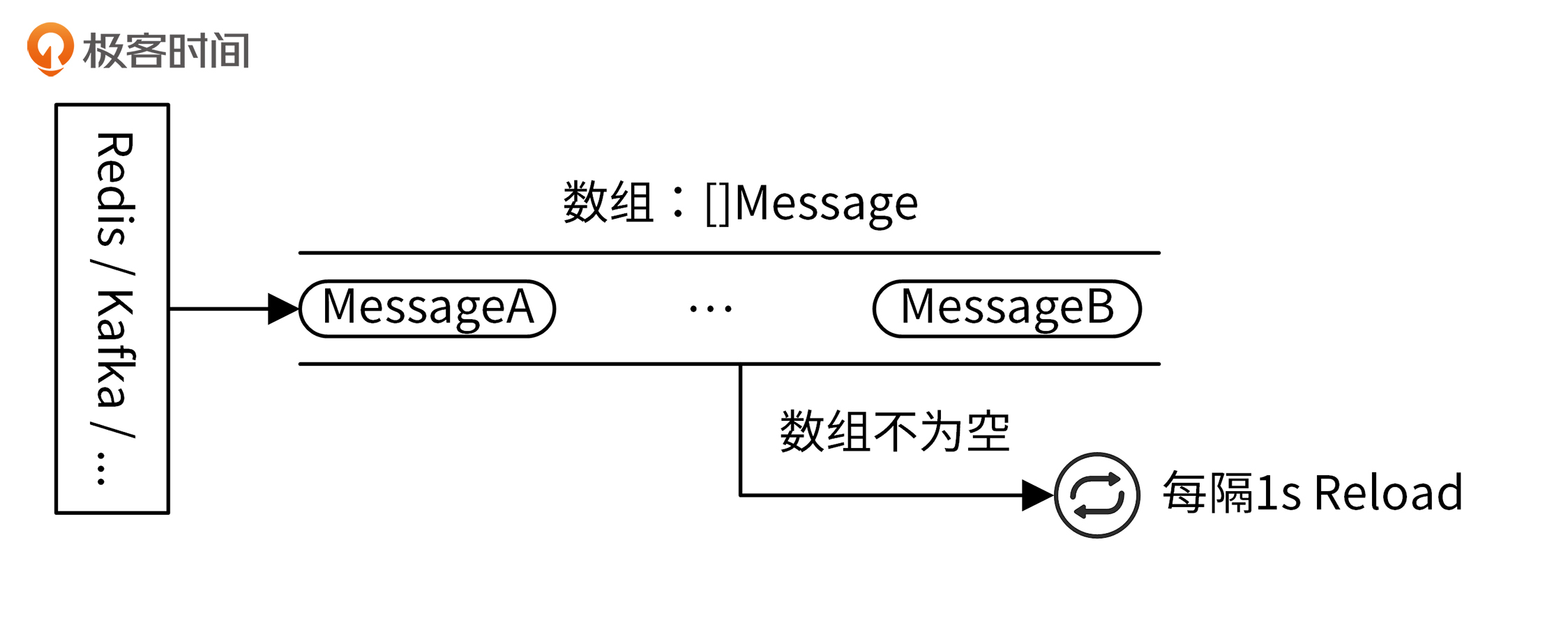 接收上游消息(这里是从Redis中接收),将消息缓存到切片或者带缓冲的channel中,并启动一个消费协程去消费这些消息。这里的消费协程是reloadLoop,reloadLoop会每隔1s判断 requeue 切片是否长度为0,如果不为0,则执行 l.DoReload() 缓存密钥和策略。