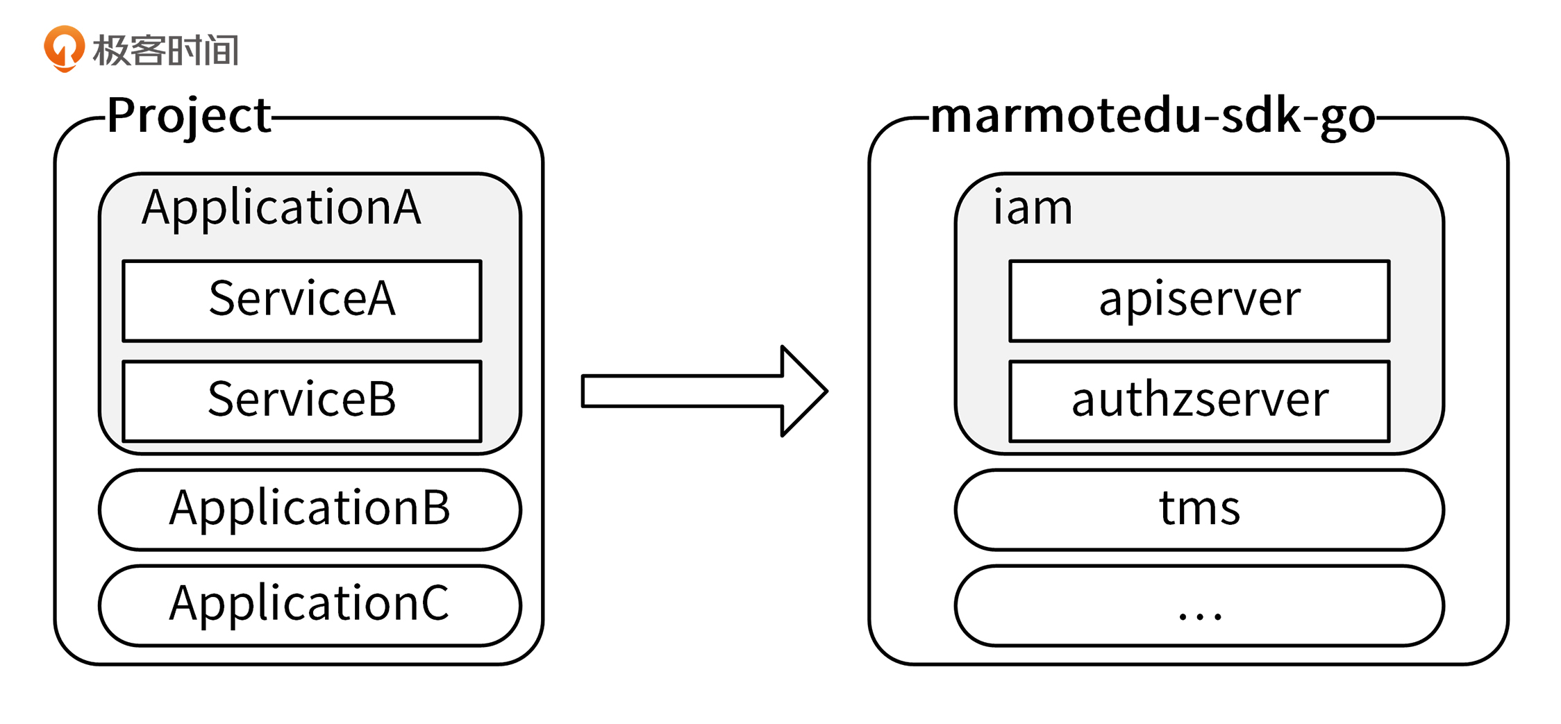 Go项目的组织方式是有层级的:Project -> Application -> Service。marmotedu-sdk-go很好地体现了这种层级关系,使得SDK的调用更加易懂、易用。marmotedu-sdk-go的层级关系如下图所示: