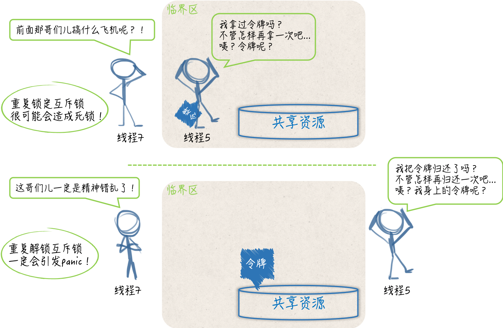 一个goroutine对某一个互斥锁的重复锁定,就意味着它自己锁死了自己。先不说这种做法本身就是错误的,在这种情况下,想让其他的goroutine来帮它解锁是非常难以保证其正确性的。