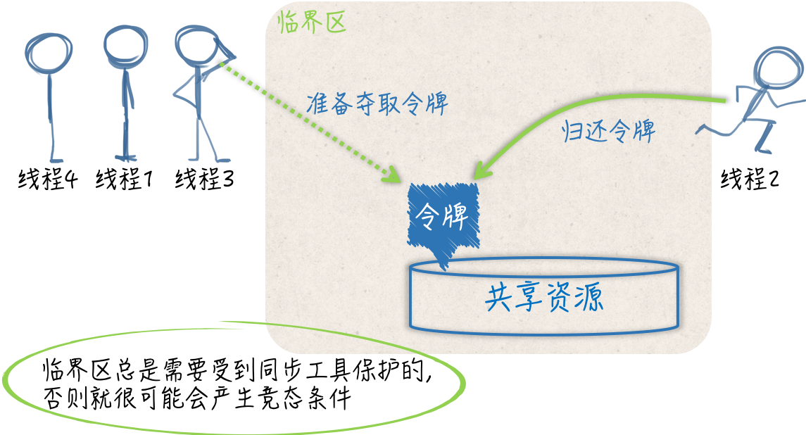 如果针对某个共享资源的访问令牌只有一块,那么在同一时刻,就最多只能有一个线程进入到那个区域,并访问到该资源。