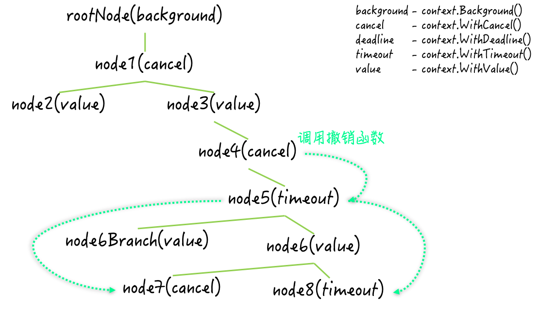 正因为如此,所有的Context值共同构成了一颗代表了上下文全貌的树形结构。这棵树的树根(或者称上下文根节点)是一个已经在context包中预定义好的Context值,它是全局唯一的。通过调用context.Background函数,我们就可以获取到它(我在coordinateWithContext函数中就是这么做的)。
