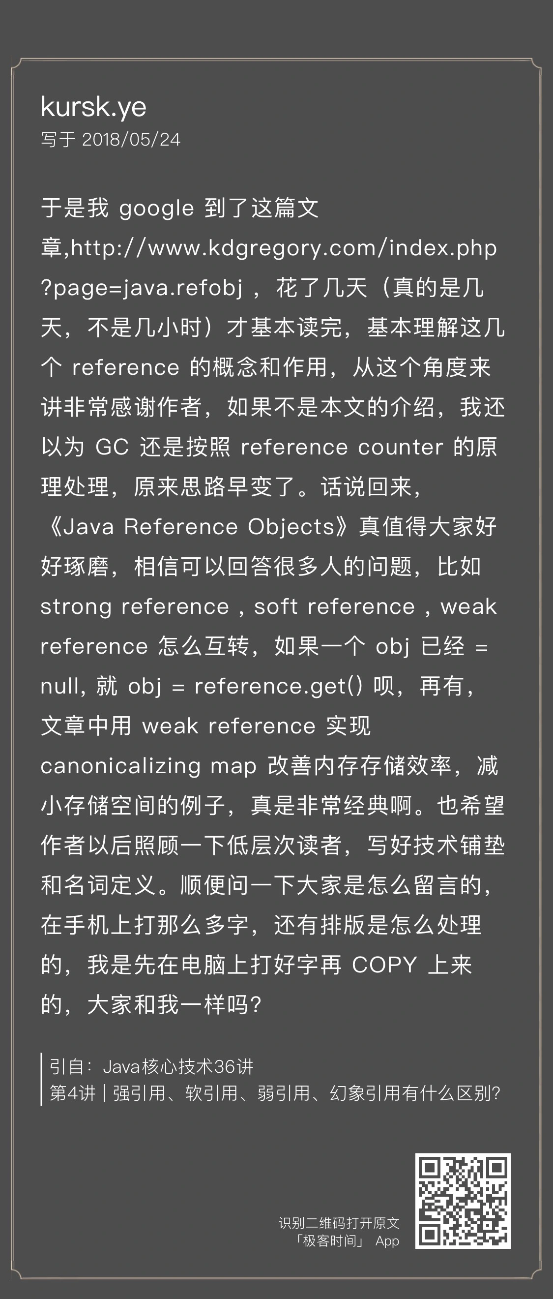 • 带着问题和明确目的去阅读,比如,以 debug 某个问题的角度,结合实践去验证,让自己能够感到收获,既加深理解,也有实际帮助,激励我们坚持下来。