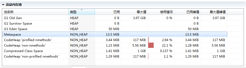 在 JMC 或 JConsole 的内存管理界面,会统计部分非堆内存,但提供的信息相对有限,下图就是 JMC 活动内存池的截图。