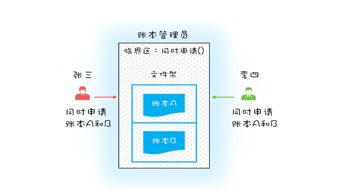 可以增加一个账本管理员,然后只允许账本管理员从文件架上拿账本,也就是说柜员不能直接在文件架上拿账本,必须通过账本管理员才能拿到想要的账本。例如,张三同时申请账本A和B,账本管理员如果发现文件架上只有账本A,这个时候账本管理员是不会把账本A拿下来给张三的,只有账本A和B都在的时候才会给张三。这样就保证了“一次性申请所有资源”。