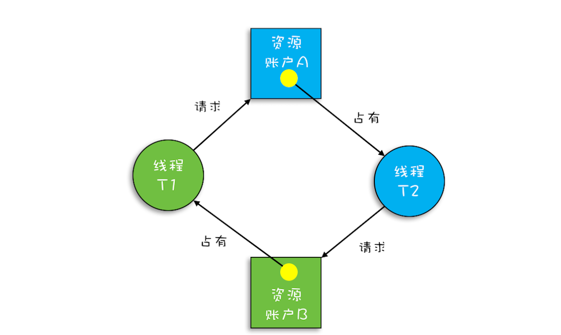 关于这种现象,我们还可以借助资源分配图来可视化锁的占用情况(资源分配图是个有向图,它可以描述资源和线程的状态)。其中,资源用方形节点表示,线程用圆形节点表示;资源中的点指向线程的边表示线程已经获得该资源,线程指向资源的边则表示线程请求资源,但尚未得到。转账发生死锁时的资源分配图就如下图所示,一个“各据山头死等”的尴尬局面。