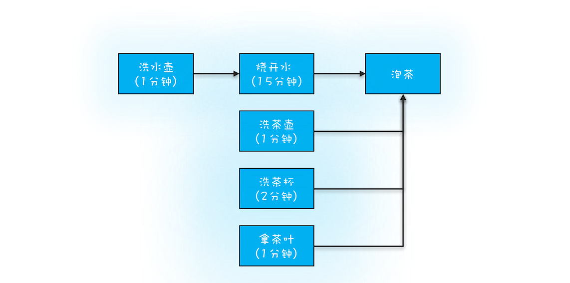 记得以前初中语文课文里有一篇著名数学家华罗庚先生的文章《统筹方法》,这篇文章里介绍了一个烧水泡茶的例子,文中提到最优的工序应该是下面这样: