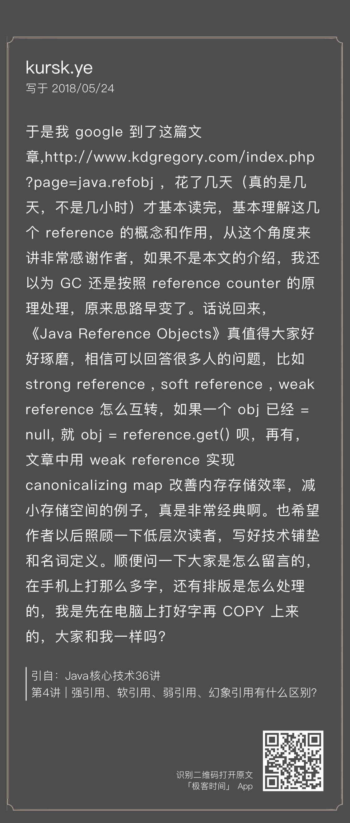 那么,源代码需要理解到什么程度呢?- 对于底层技术,这个确实是比较有争议的问题,我个人并不觉得什么东西都要理解底层,懂当然好,但不能代表一切,毕竟知识和能力是有区别的,当然我们也要尊重面试官的要求。我个人认为,不是所有做Java开发的人,都需要读JVM源代码,虽然我在专栏中提供了一些底层源代码解读,但也只是希望真的有兴趣、有需要的工程师跟进学习。对于大多数开发人员,了解一些源代码,至少不会在面试问到的时候完全没有准备。