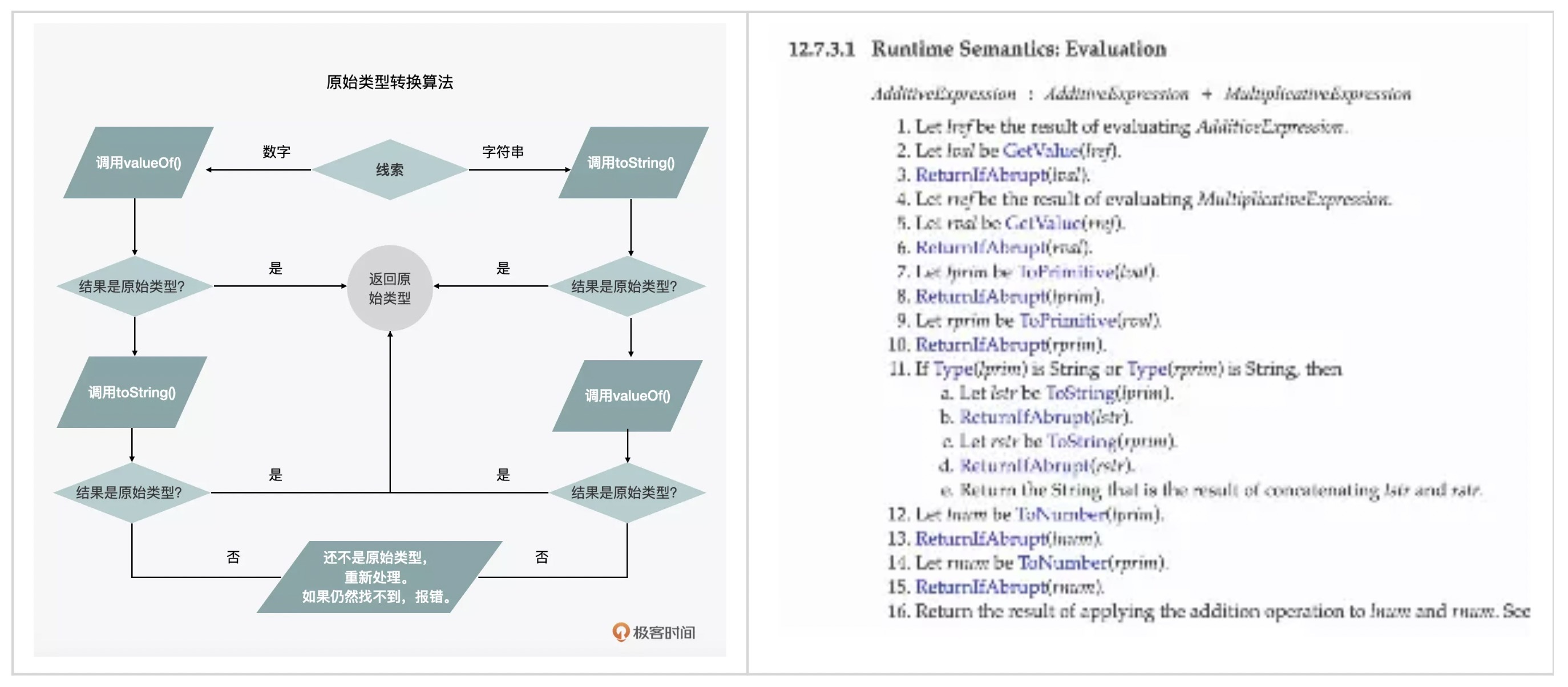 以上面这段代码为例,当a = 42时,它是一个数字,b通过隐性的强制多态,把它变成了一个字符串。c则通过显性的强制多态,把它变成了一个字符串。在ECMAScript 的官方文档中,有相关的运行时的判断条件,实际浏览器会通过类似以下的算法来判断对应的处理。