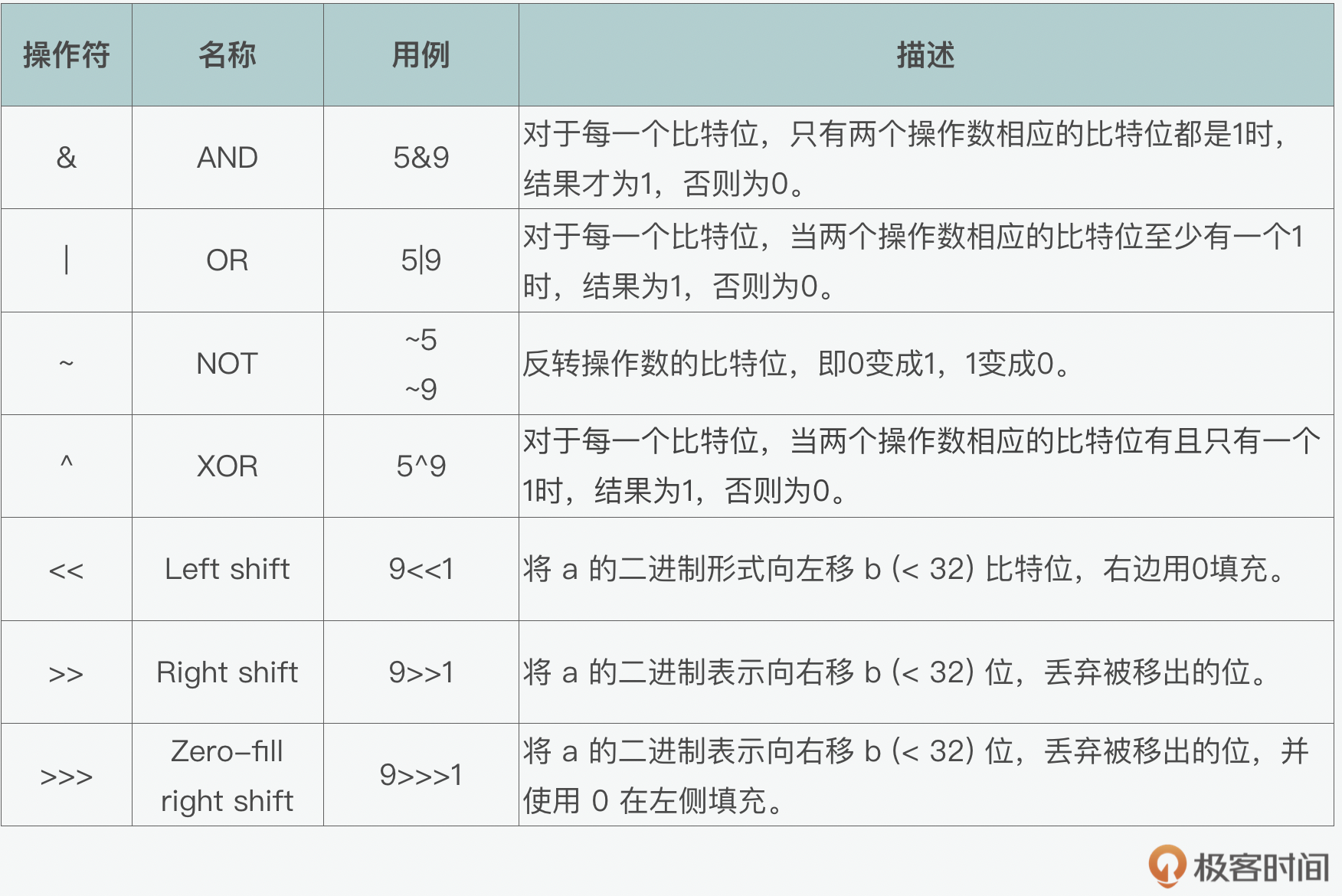讲完以上几种算法,我还想再延伸一点知识。在数据结构和算法中,除了动态规划外,还有哪些可以提高性能的算法思想呢?这里我们可以结合JavaScript的特性看看位运算(bitwise operation)的使用和思想。