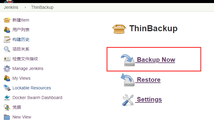 在插件管理页面找到ThinBackup插件,安装即可(如果你不会安装,看一下第二篇的内容吧)。安装完以后,在manage jenkins界面会出现ThinBackup菜单项,点击进去后进入settings设置界面,进行备份设置。如下所示设置: