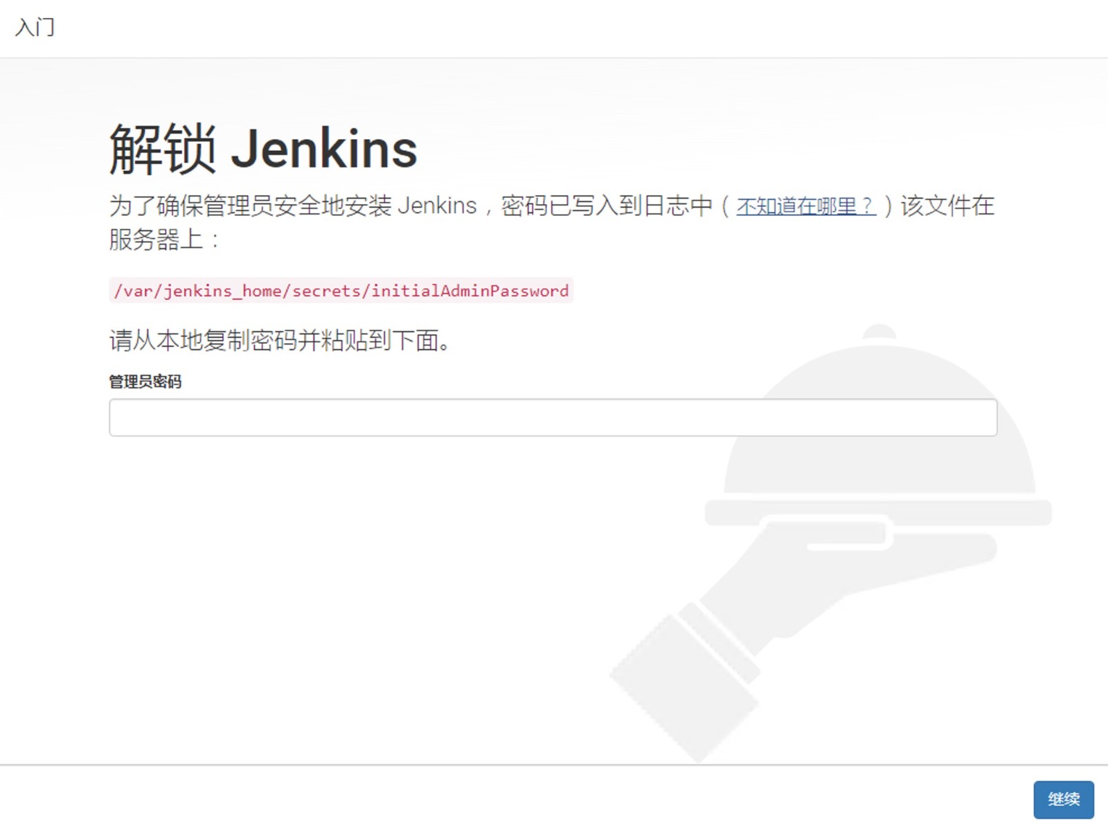 提示管理员秘密从/var/jenkins_home/secrets/initialAdminPassword路径获取(对于使用war包或者rpm包安装的Jenkins路径可能会有所差异),如果使用rpm方式或者war包安装,直接在jenkins所在服务器上cat一下该文件即可,如果是docker方式安装,可根据上面获取的Container_ID或者Container_name执行docker命令:
