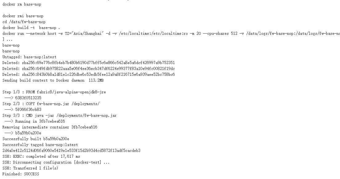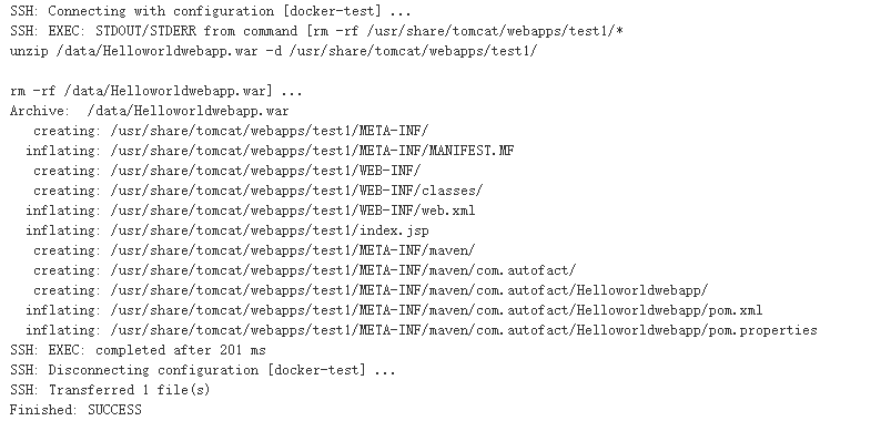 exec command表示在远程服务器上执行shell命令,此处的命令是一行一行执行的,并且上一条命令执行出错并不影响下条命令的执行,但是如果这些命令是有依赖关系的(比如下条命令依赖上条命令),会导致部署失败。这里为了方便测试和学习,先将命令一行一行写出来,也可以将上面的命令写成一个脚本,然后通过执行脚本去部署服务。