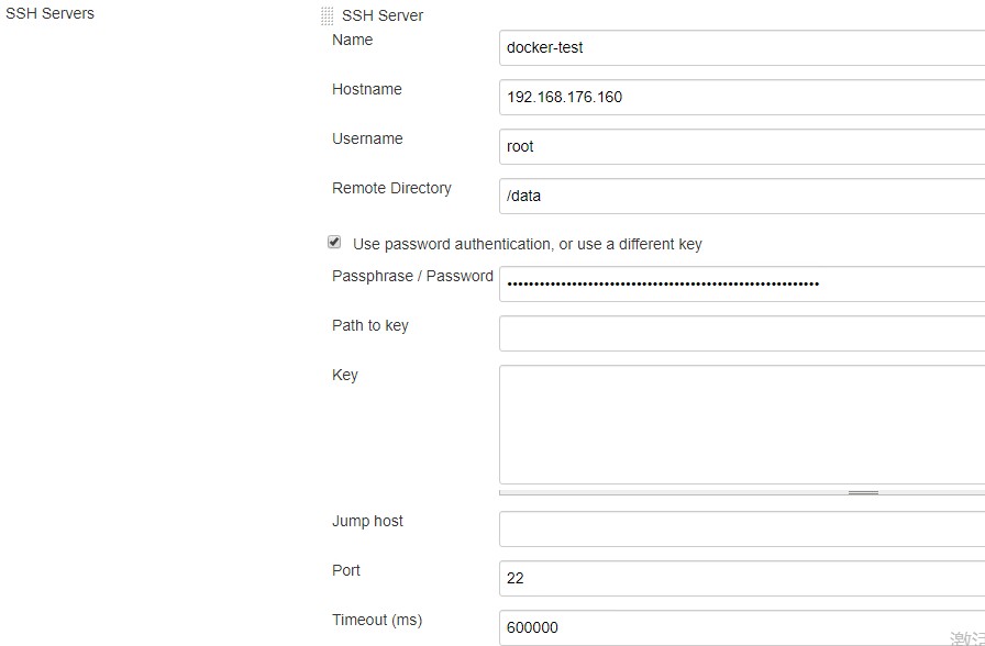 如果担心远程服务器主机更改密码频繁,配置连接该主机也可以通过ssh-key的方式,主要配置上面的path to key或者key参数。其中,Path to key参数用来配置key文件(私钥)的路径。Key参数可用于将私钥复制到这个框中。如果你启动Jenkins服务用户已经做了对目标主机的免密认证,也可以不用配置这两个参数