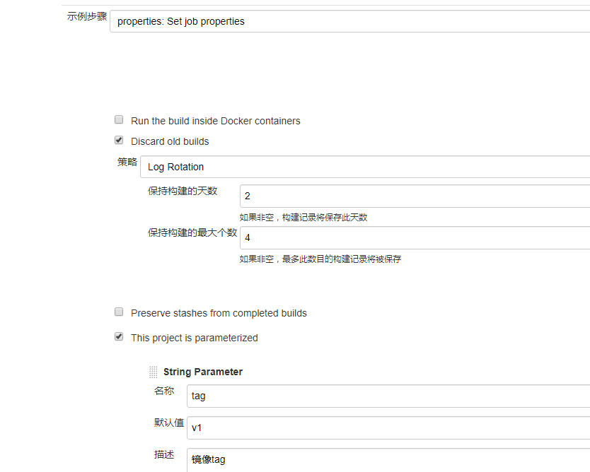 声明式脚本通过parameters来定义流水线中使用到的参数,在脚本式语法中则需要通过properties关键字来定义在stage中使用的参数,可以通过片段生成器生(参考下面)成相应的语法片段。