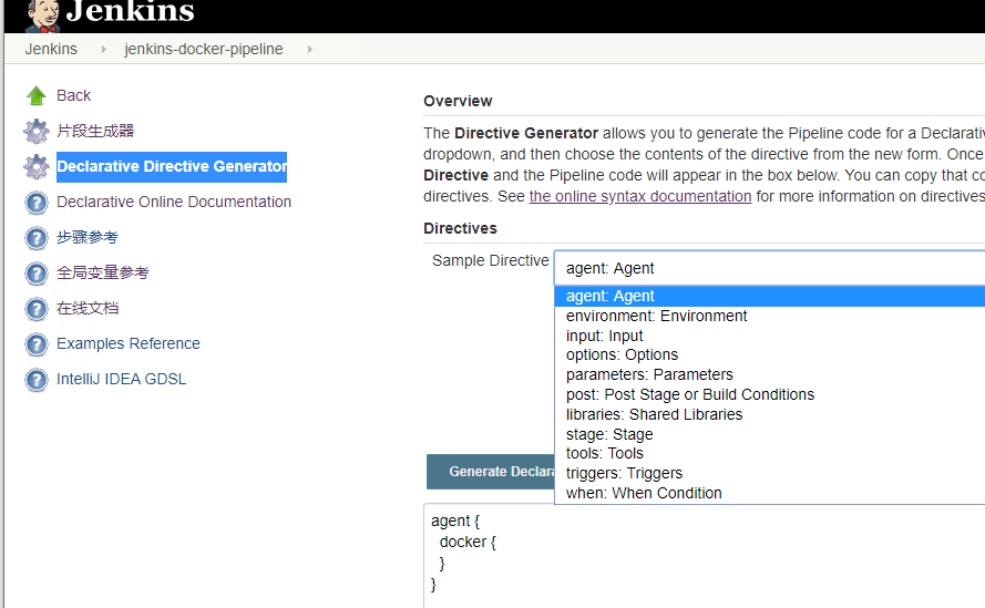 Jenkins对于片段生成器分成了两种类别,一种是基于pipeline声明式语法的片段生成器(Declarative Directive Generator菜单),另一种是基于jenkins内置插件以及脚本式语法使用(片段生成器菜单)的片段生成器。下面分别对这两种生成器进行介绍