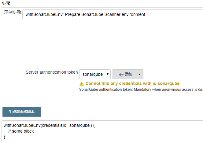 选择好凭据以后生成语法片段,然后将在之前章节中使用的sonar-scanner命令以及参数粘贴到withSonarQubeEnv(){}代码块里即可,如下所示: