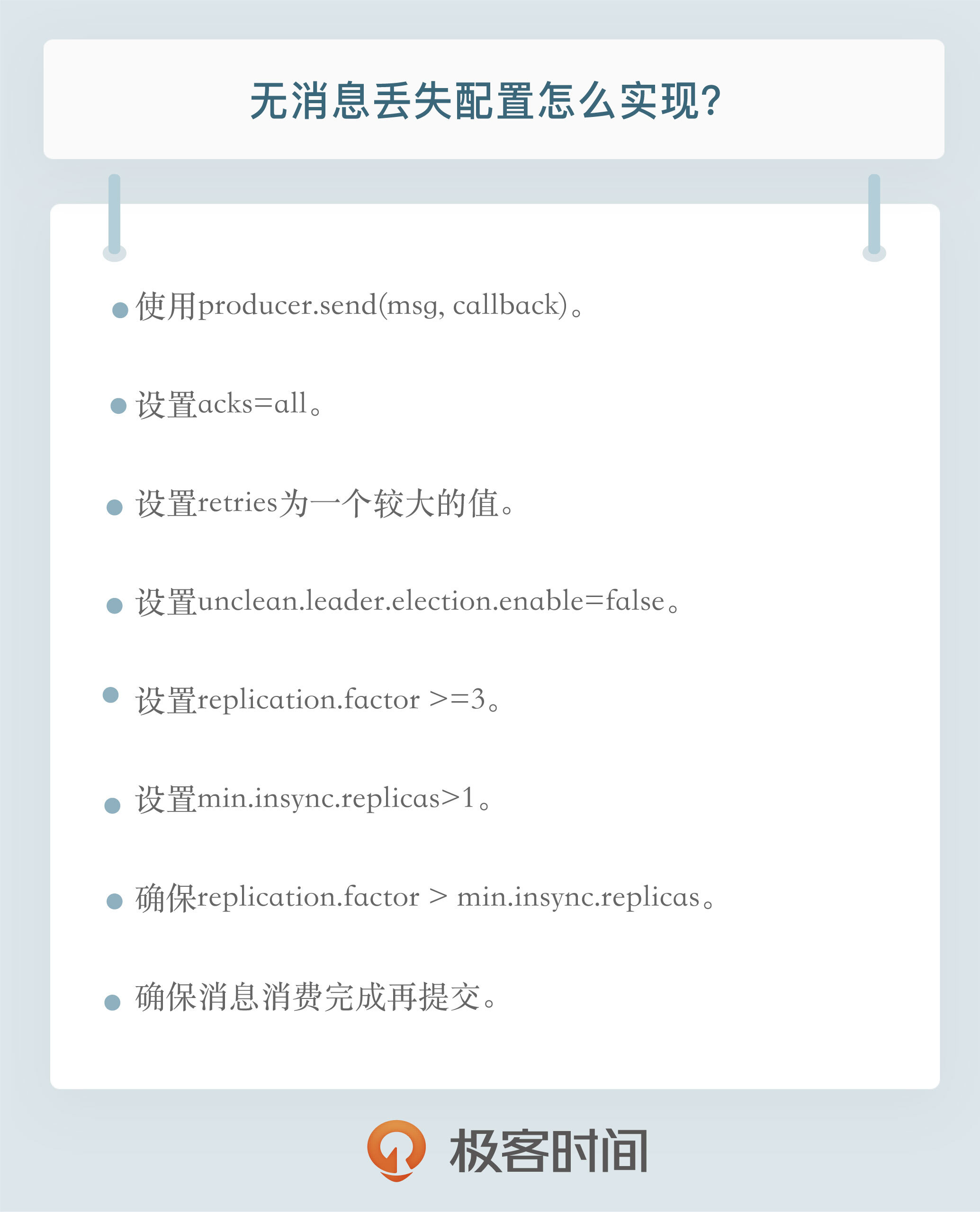 今天,我们讨论了Kafka无消息丢失的方方面面。我们先从什么是消息丢失开始说起,明确了Kafka持久化保证的责任边界,随后以这个规则为标尺衡量了一些常见的数据丢失场景,最后通过分析这些场景,我给出了Kafka无消息丢失的“最佳实践”。总结起来,我希望你今天能有两个收获: