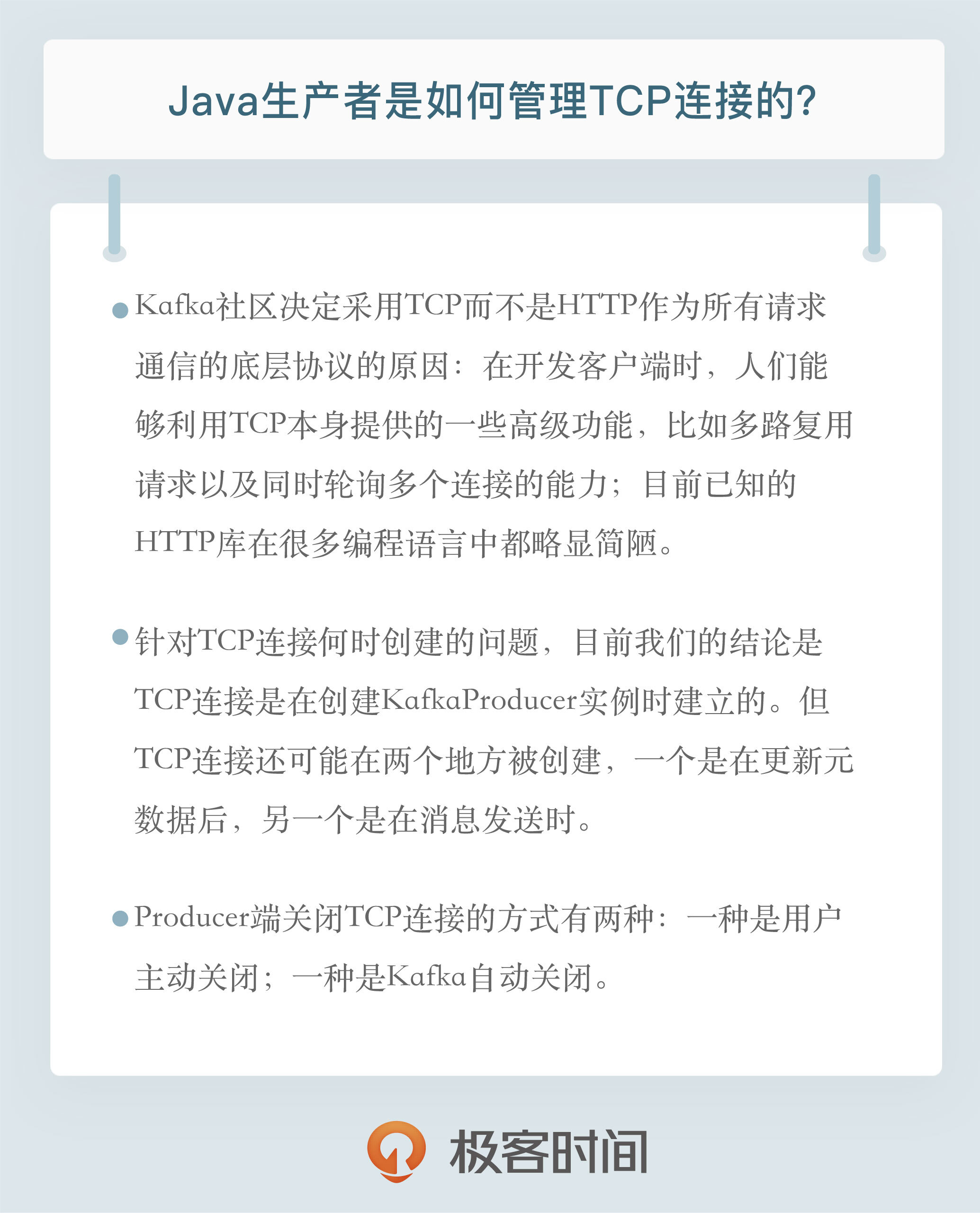 我们来简单总结一下今天的内容。对最新版本的Kafka(2.1.0)而言,Java Producer端管理TCP连接的方式是:
