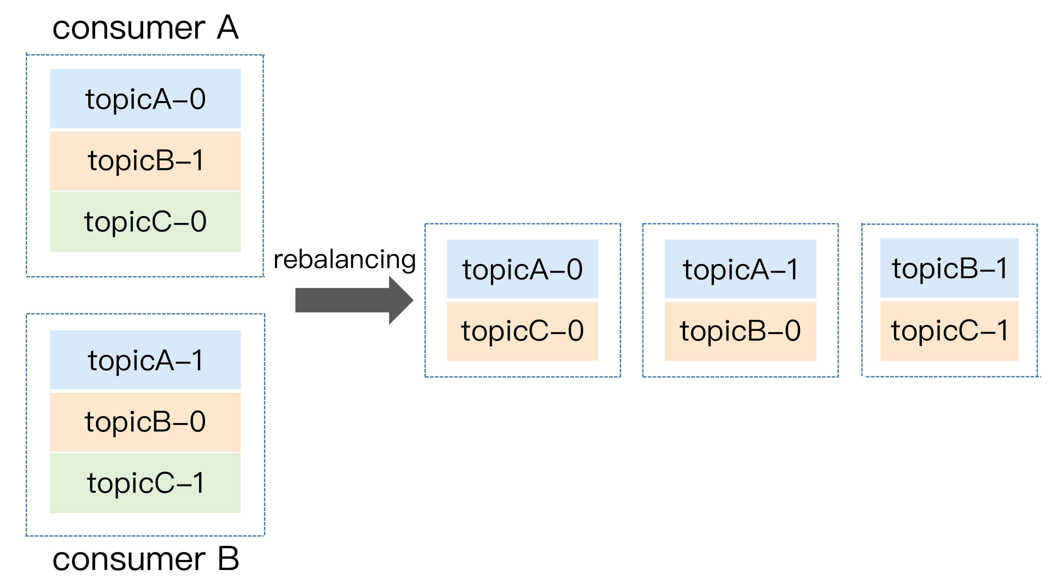我们举个简单的例子来说明一下Consumer Group发生Rebalance的过程。假设目前某个Consumer Group下有两个Consumer,比如A和B,当第三个成员C加入时,Kafka会触发Rebalance,并根据默认的分配策略重新为A、B和C分配分区,如下图所示: