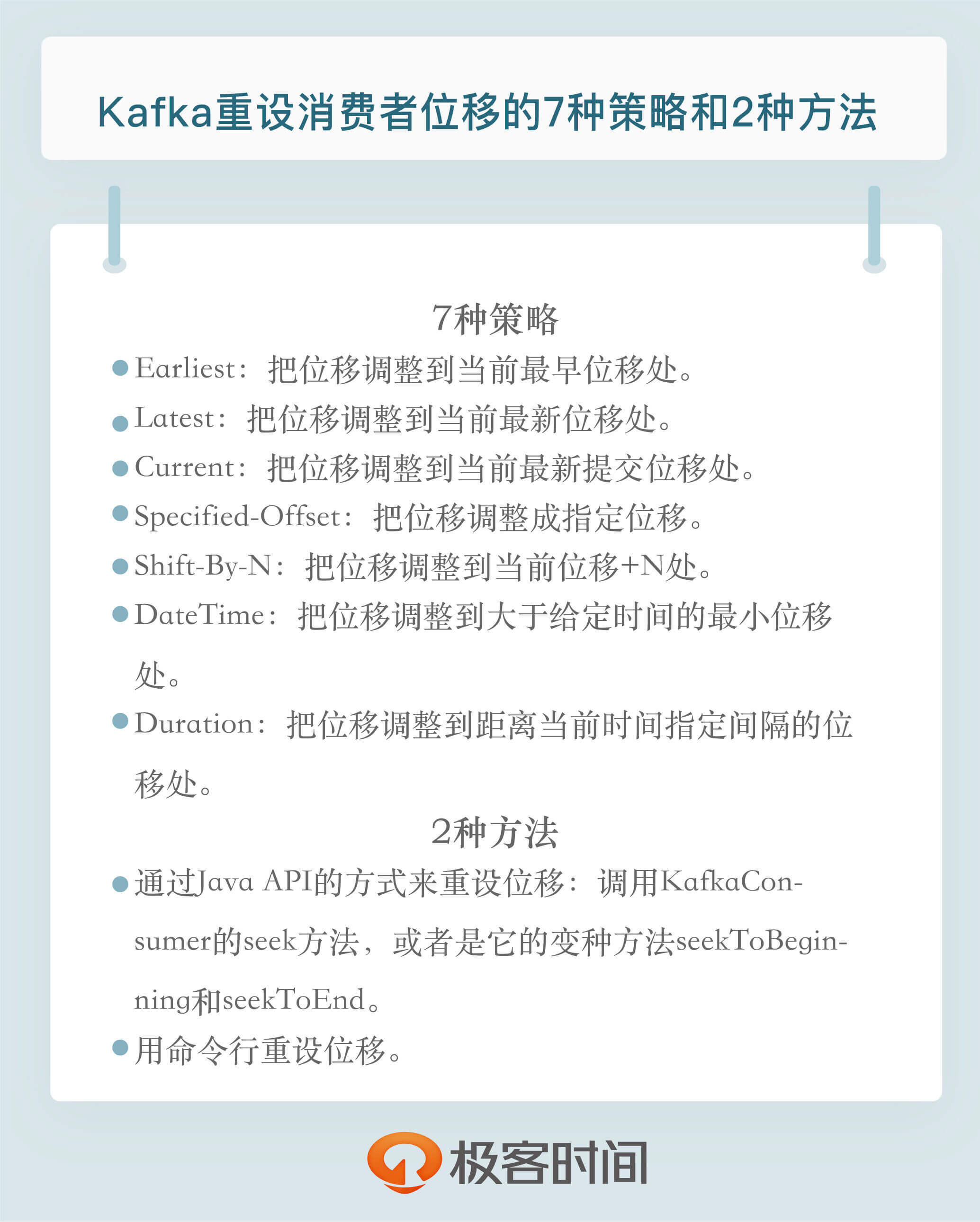 至此,重设消费者组位移的2种方式我都讲完了。我们来小结一下。今天,我们主要讨论了在Kafka中,为什么要重设位移以及如何重设消费者组位移。重设位移主要是为了实现消息的重演。目前Kafka支持7种重设策略和2种重设方法。在实际使用过程中,我推荐你使用第2种方法,即用命令行的方式来重设位移。毕竟,执行命令要比写程序容易得多。但是需要注意的是,0.11及0.11版本之后的Kafka才提供了用命令行调整位移的方法。如果你使用的是之前的版本,那么就只能依靠API的方式了。