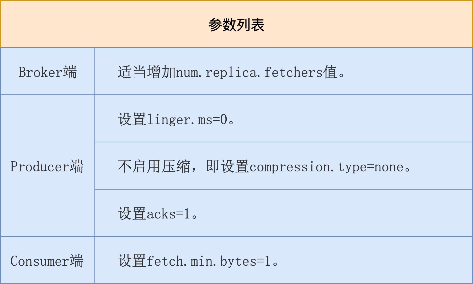 在Broker端,我们依然要增加num.replica.fetchers值以加快Follower副本的拉取速度,减少整个消息处理的延时。