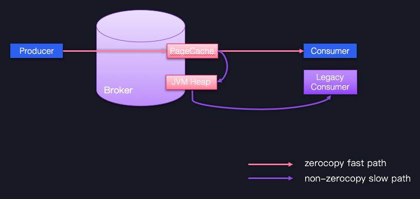 图中蓝色的Producer、Consumer和Broker的版本是相同的,它们之间的通信可以享受Zero Copy的快速通道;相反,一个低版本的Consumer程序想要与Producer、Broker交互的话,就只能依靠JVM堆中转一下,丢掉了快捷通道,就只能走慢速通道了。因此,在优化Broker这一层时,你只要保持服务器端和客户端版本的一致,就能获得很多性能收益了。