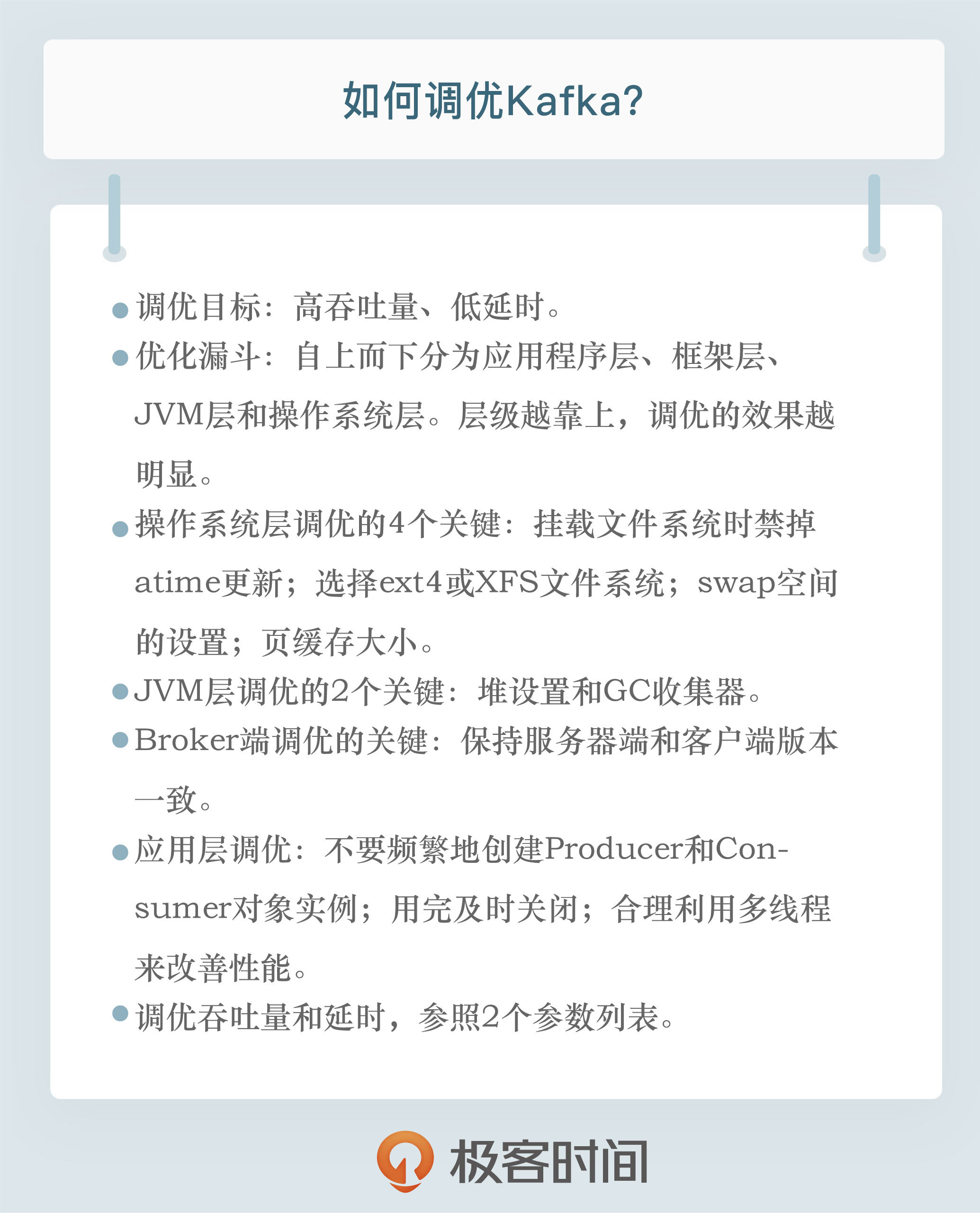 好了,我们来小结一下。今天,我跟你分享了Kafka调优方面的内容。我们先从调优目标开始说起,然后我给出了调优层次漏斗,接着我分享了一些基础性调优,包括操作系统层调优、JVM层调优以及应用程序调优等。最后,针对Kafka关心的两个性能指标吞吐量和延时,我分别从Broker、Producer和Consumer三个维度给出了一些参数值设置的最佳实践。