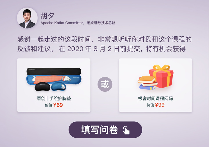 我给你准备了一份结课问卷,希望你能在问卷里聊一聊你对这门课的看法。欢迎你点击下面的图片,用1~2分钟时间填写问卷,期待你畅所欲言。