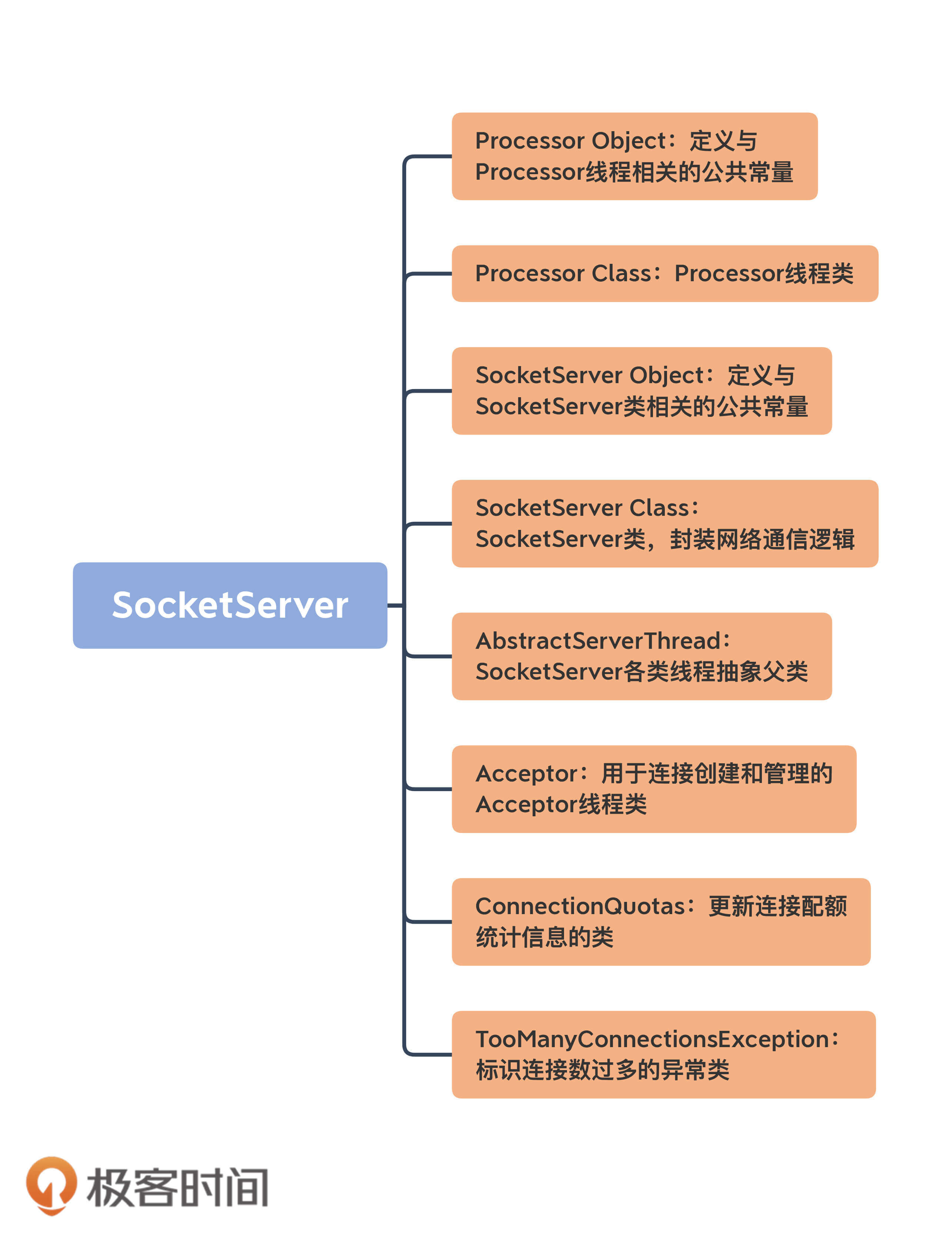 乍一看组件有很多,但你也不必担心,我先对这些组件做个简单的介绍,然后我们重点学习一下Acceptor类和Processor类的源码。毕竟,这两个类是实现网络通信的关键部件。另外,今天我给出的都是SocketServer组件的基本情况介绍,下节课我再详细向你展示它的定义。