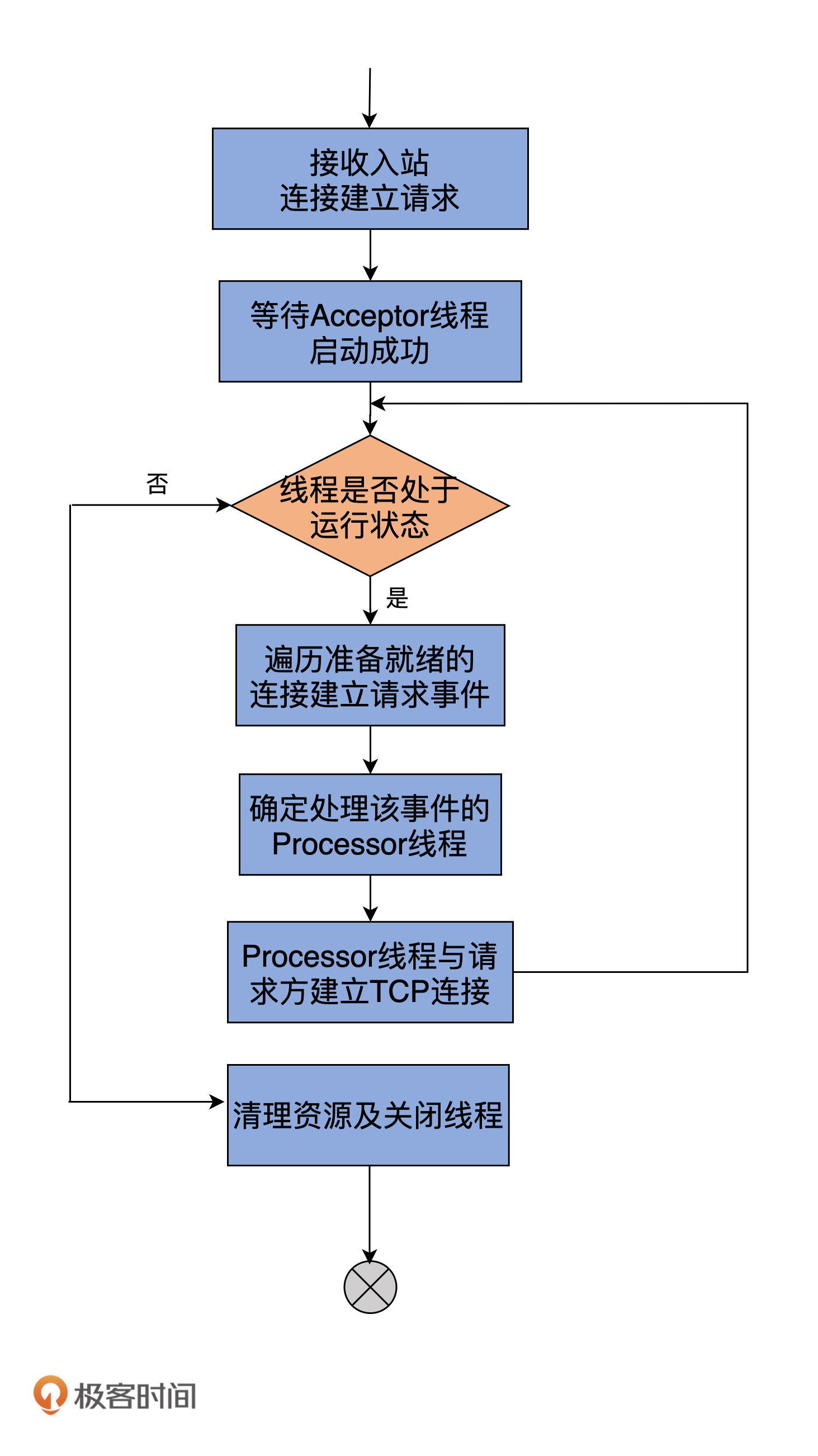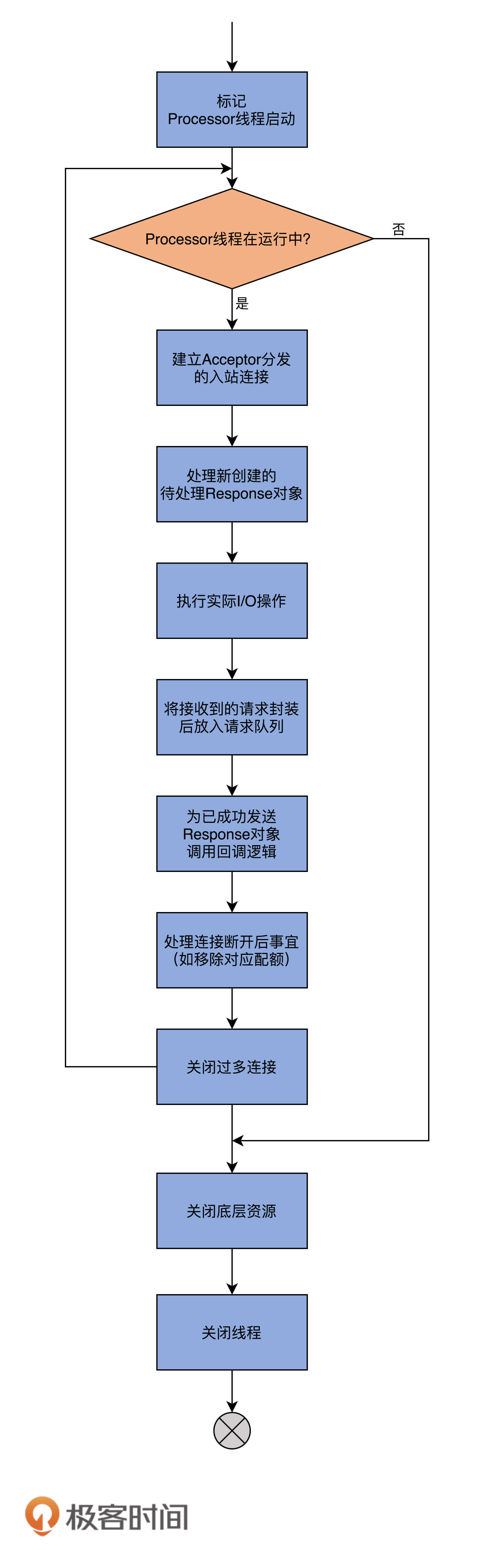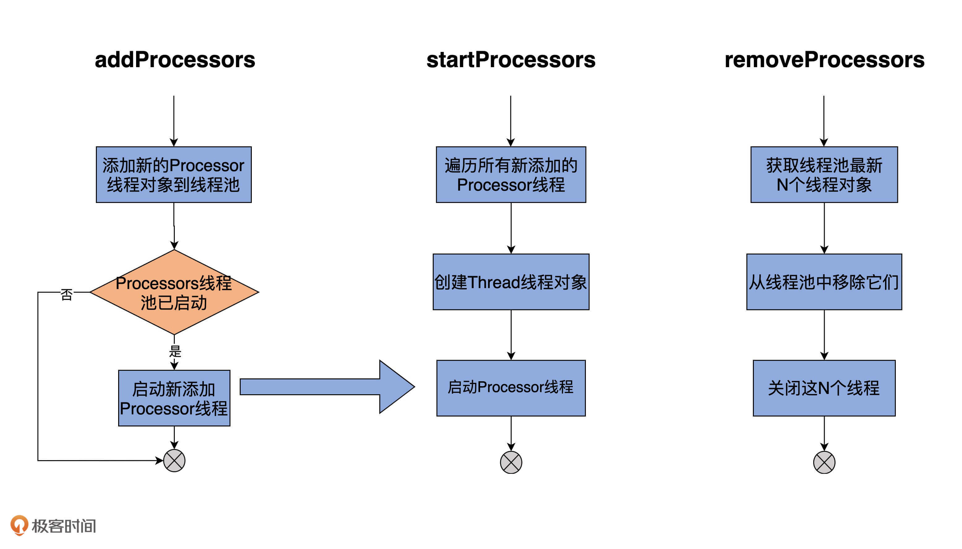 既然如此,那它就必须要定义相关的方法。Acceptor代码中,提供了3个与Processor相关的方法,分别是addProcessors、startProcessors和removeProcessors。鉴于它们的代码都非常简单,我用注释的方式给出主体逻辑的步骤: