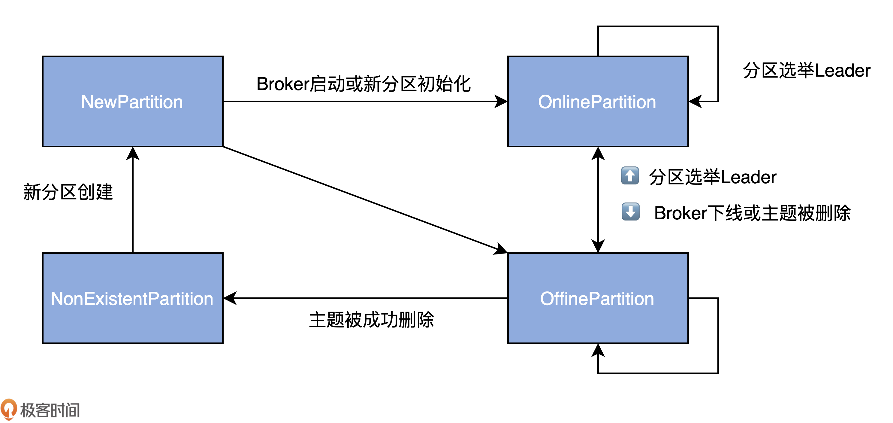 图中的双向箭头连接的两个状态可以彼此进行转换,如OnlinePartition和OfflinePartition。Kafka允许一个分区从OnlinePartition切换到OfflinePartition,反之亦然。