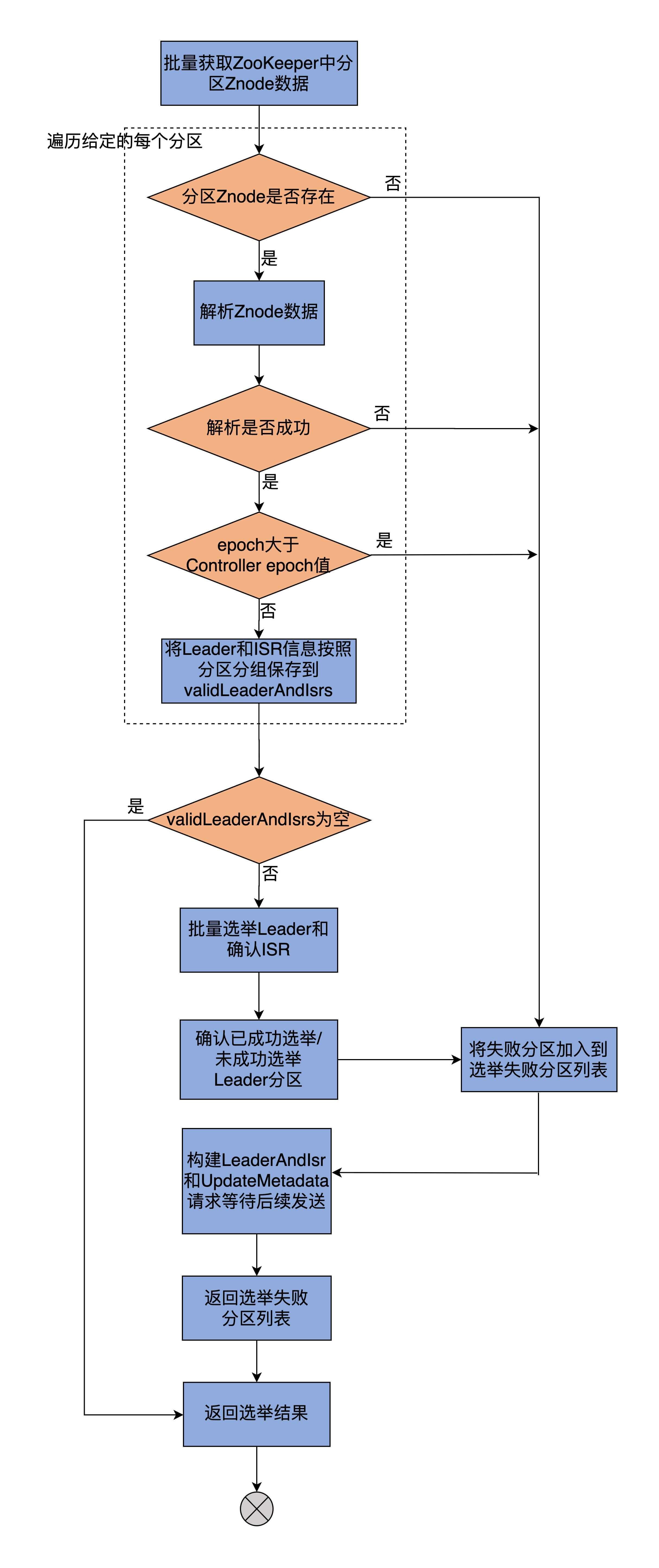 首先,代码会批量读取ZooKeeper中给定分区的所有Znode数据。之后,会构建两个容器,分别保存可选举Leader分区列表和选举失败分区列表。接着,开始遍历每个分区的Znode节点数据,如果成功拿到Znode节点数据,节点数据包含Leader和ISR信息且节点数据的Controller Epoch值小于当前Controller Epoch值,那么,就将该分区加入到可选举Leader分区列表。倘若发现Zookeeper中保存的Controller Epoch值大于当前Epoch值,说明该分区已经被一个更新的Controller选举过Leader了,此时必须终止本次Leader选举,并将该分区放置到选举失败分区列表中。