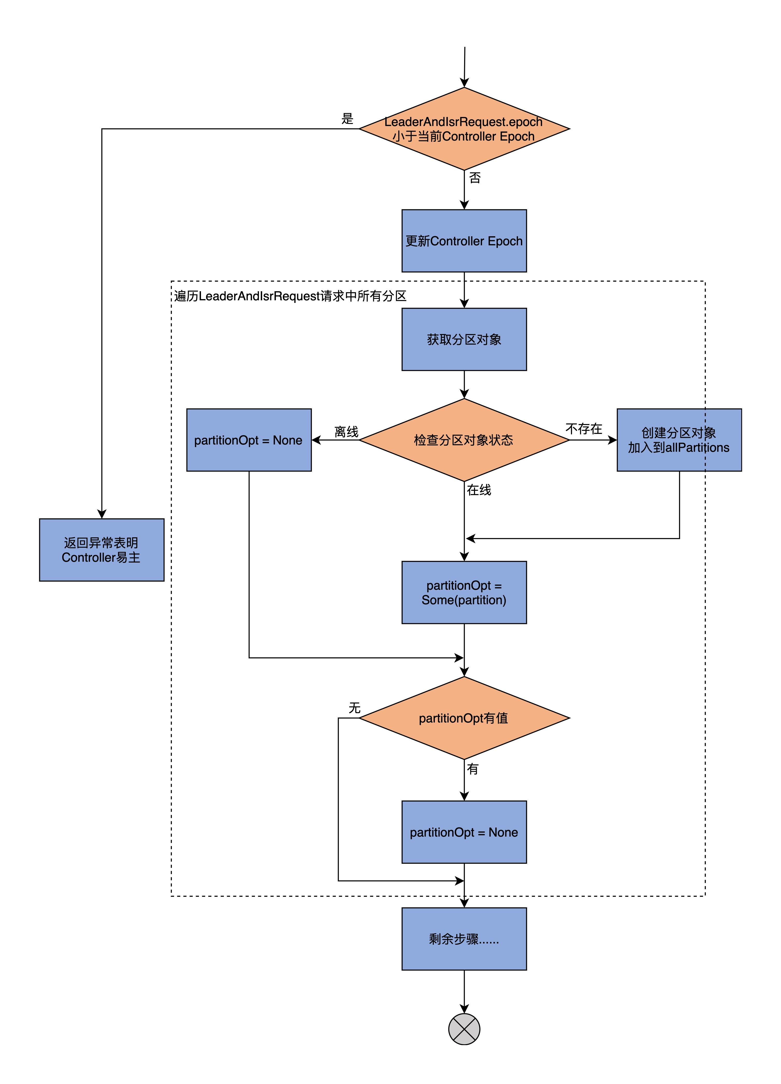 然后,becomeLeaderOrFollower方法会更新当前缓存的Controller Epoch值,再提取出LeaderAndIsrRequest请求中涉及到的分区,之后依次遍历这些分区,并执行下面的两步逻辑。