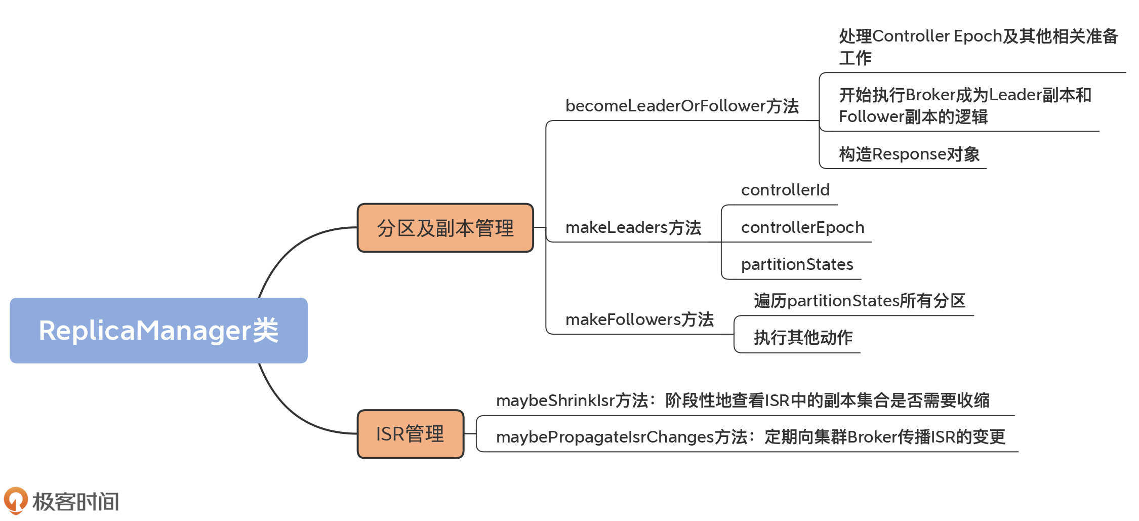 小结一下,becomeLeaderOrFollower方法第2大部分的主要功能是,调用makeLeaders和makeFollowers方法,令Broker在不同分区上的Leader或Follower角色生效。关于这两个方法的实现细节,一会儿我再详细说。