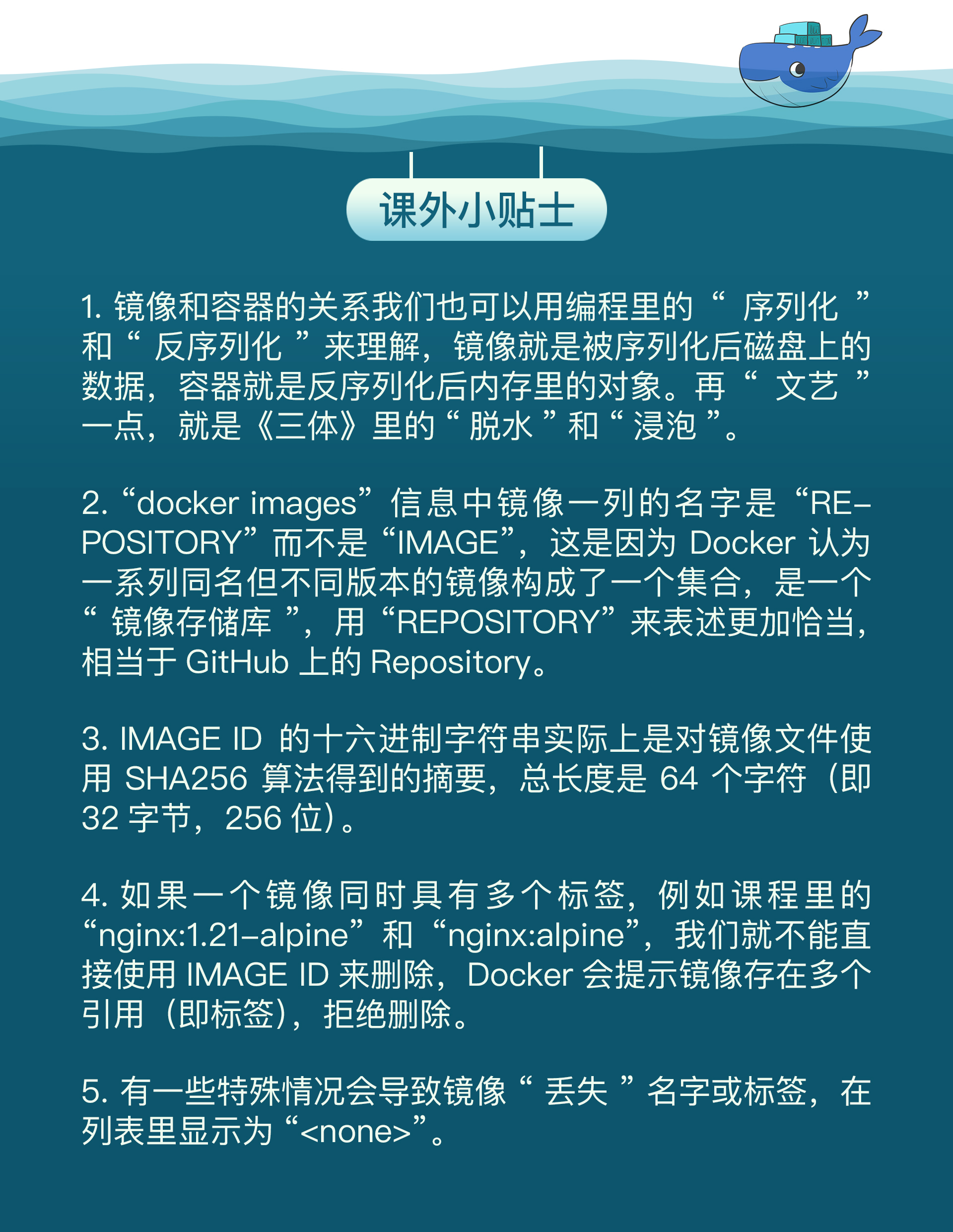 另外,你可能还会注意到,截图里的两个镜像“nginx:1.21-alpine”和“nginx:alpine”的IMAGE ID是一样的,都是“a63aa……”。这其实也很好理解,这就像是人的身份证号码是唯一的,但可以有大名、小名、昵称、绰号,同一个镜像也可以打上不同的标签,这样应用在不同的场合就更容易理解。
