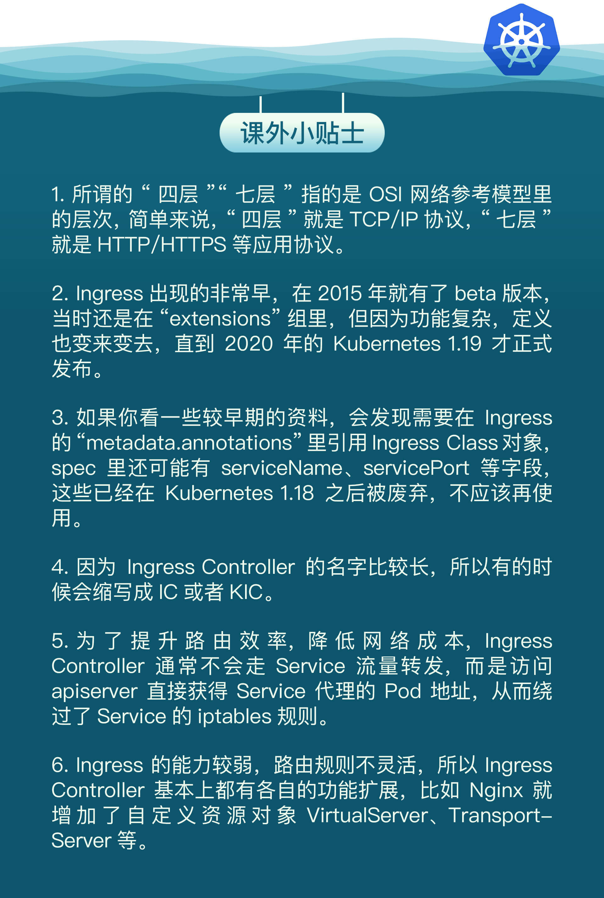 好了,今天就讲到这里,我们学习了Kubernetes里七层的反向代理和负载均衡对象,包括Ingress、Ingress Controller、Ingress Class,它们联合起来管理了集群的进出流量,是集群入口的总管。