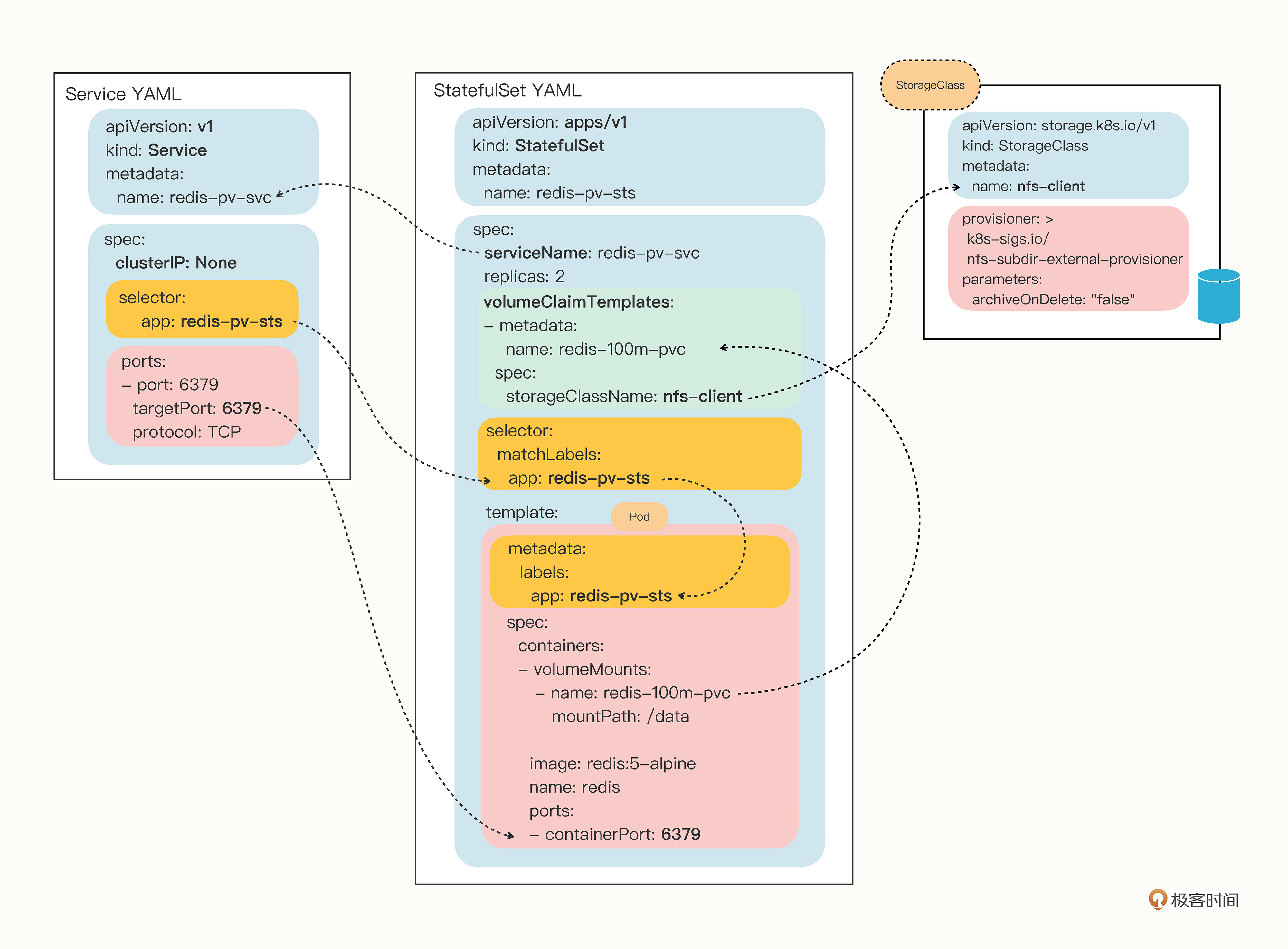 这里我给出了一个使用Redis的StatefulSet,你来看看它与Deployment有什么差异: